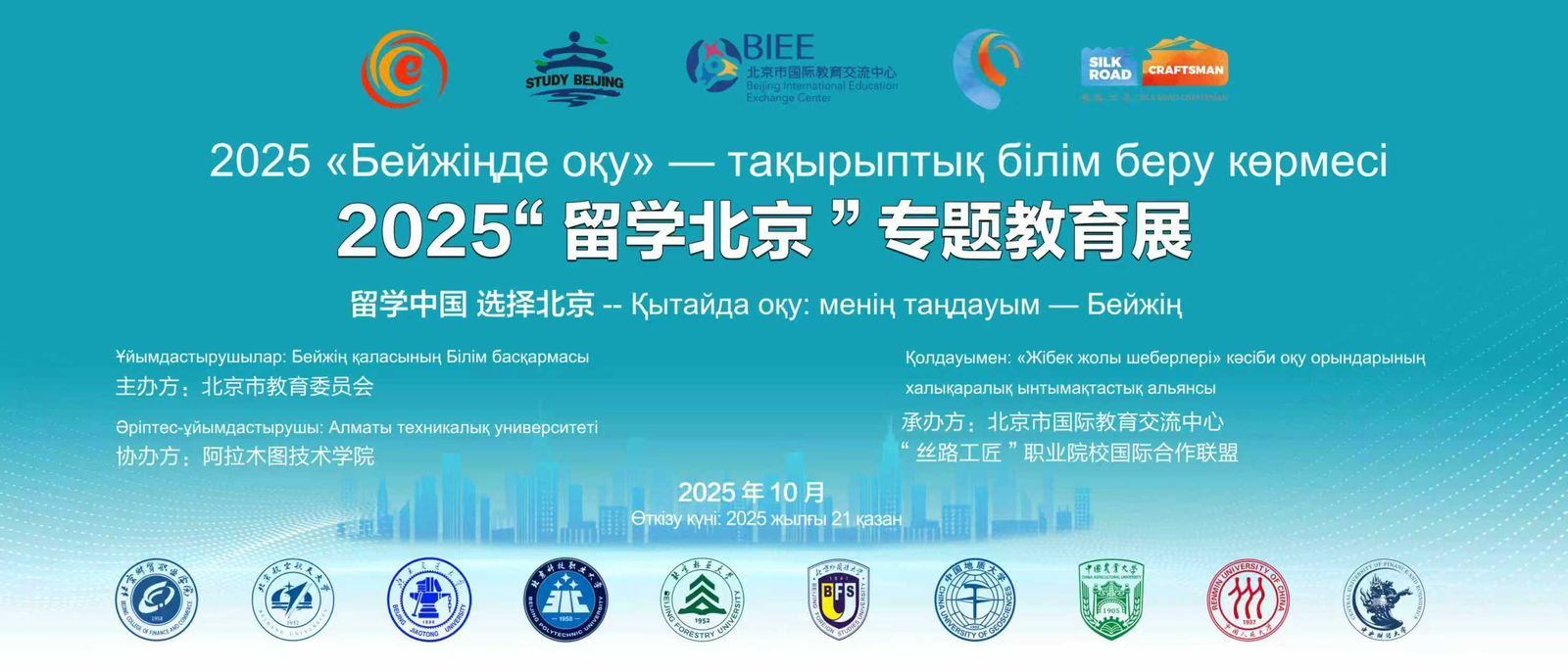 21 октября 2025 года в городе Алматы прошла Тематическая образовательная выставка «Обучение в Пекине – 2025», организованная при поддержке Международного альянса вузов «Мастера Шёлкового пути» и Управления образования города Пекин.