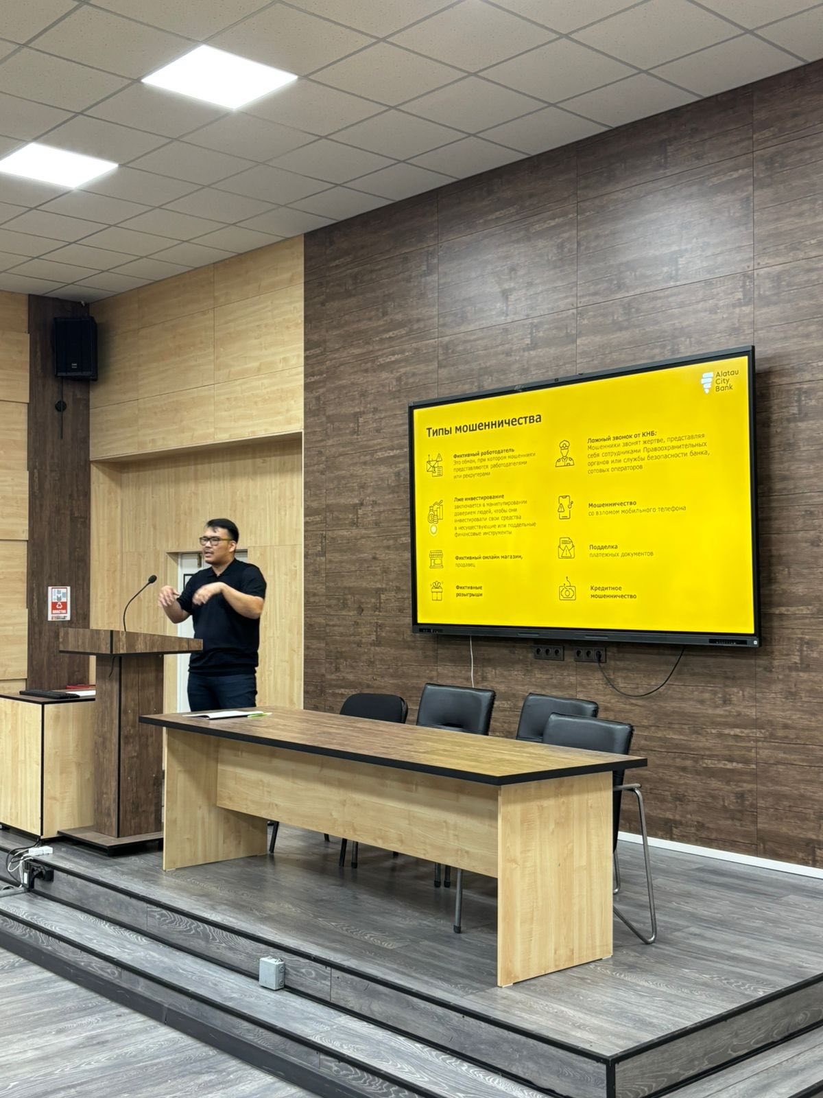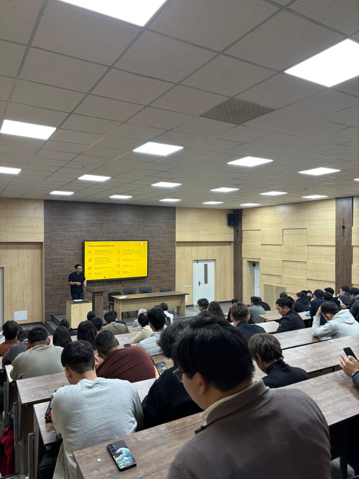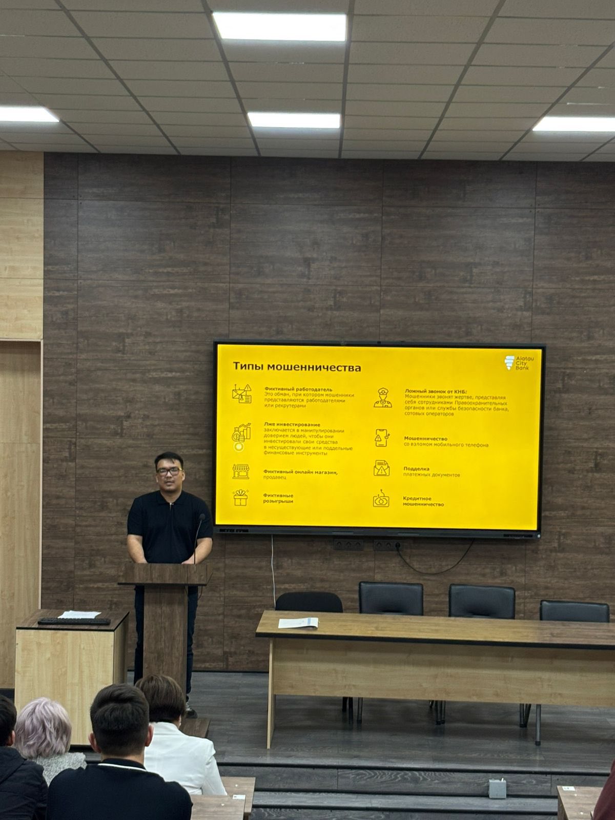 ✅ The lecture was delivered by Tole Ilyasov, Chief Manager of the Support Department of the FCCC at Alatau City Bank, who provided participants with comprehensive information about modern financial threats, types of cyber fraud, and methods of prevention.