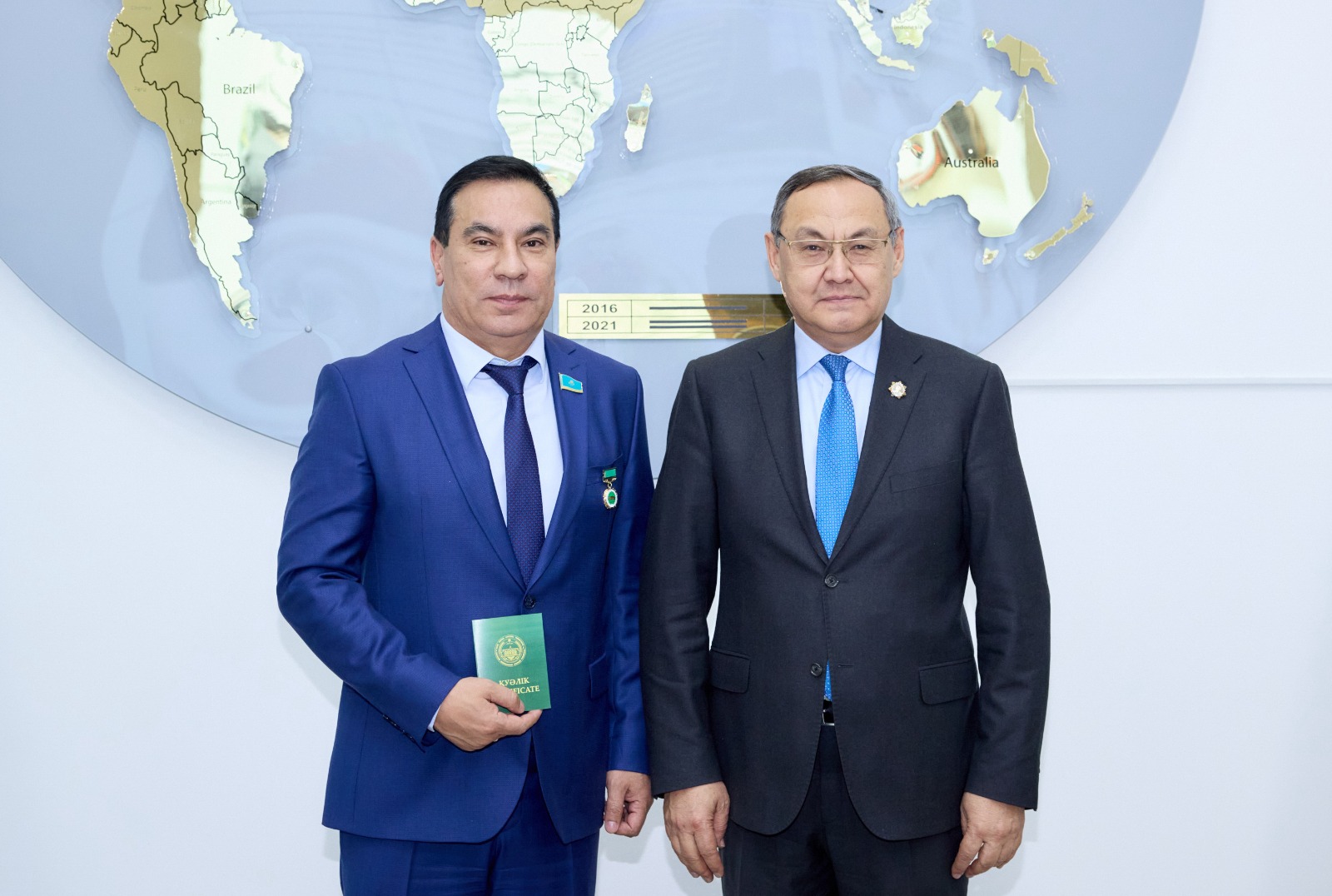 By decision of the Academic Council, the Chairman of the Board – Rector of the University, Akylbek Kurishbayev, awarded Senator Zakirzhan Pirmukhameduly Kuziyev with the badge “For Contribution to Agricultural Education, Science, and Production” for his contribution to enhancing students’ professional skills and supporting their industrial training.