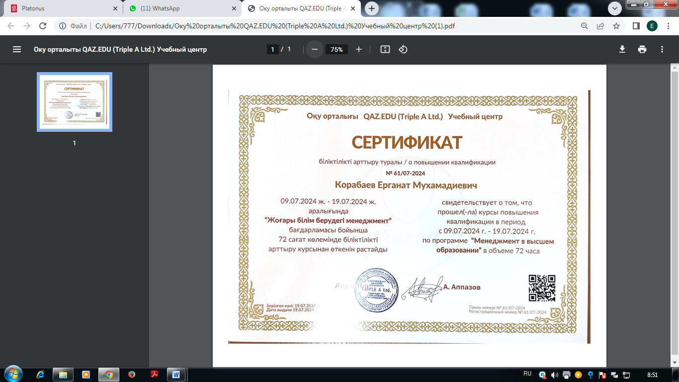 - Advanced training course on the program "management in higher education" in the amount of 72 hours from 09.07. to 19.07.2024
