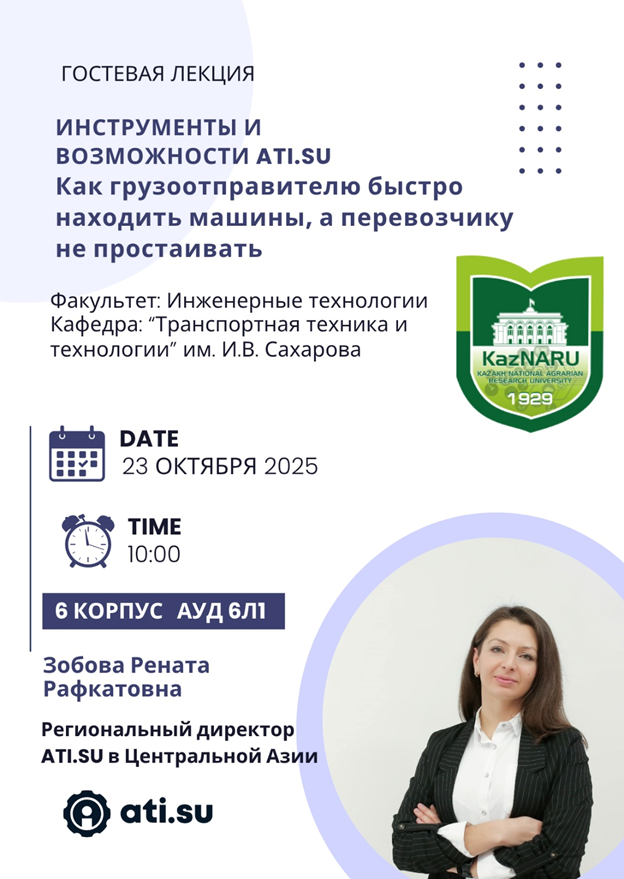 ㅤ6)ㅤкафедра оқытушыларын көлік техникасы мен технологиясы саласындағы жаңа ғылыми әзірлемелер, тасымалдауды ұйымдастыру және көлікті пайдалану, логистика туралы хабардар етуді ұйымдастыру;