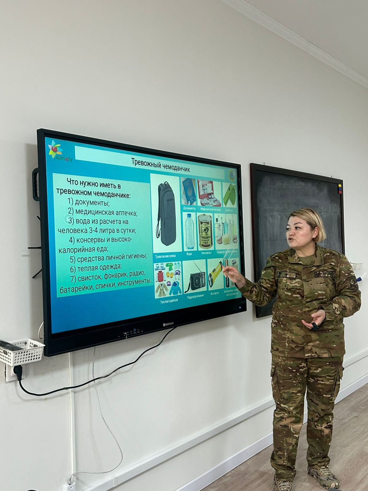 Дәрісті Қазақстан Республикасы Төтенше жағдайлар министрлігінің Азаматтық қорғаныс басқармасының аға офицері, майор Баймуханбетова Сандуғаш Амантаевна жүргізді.