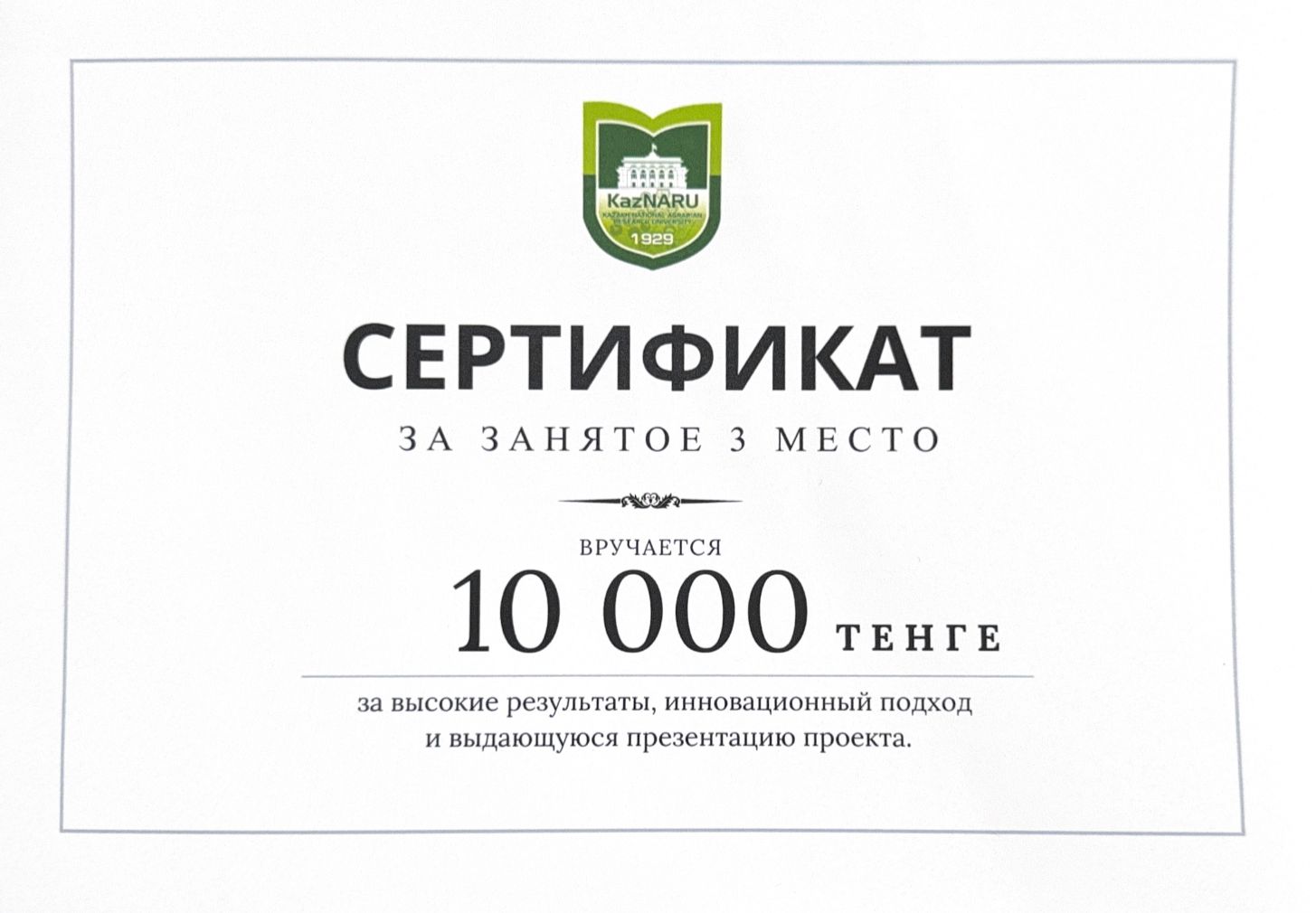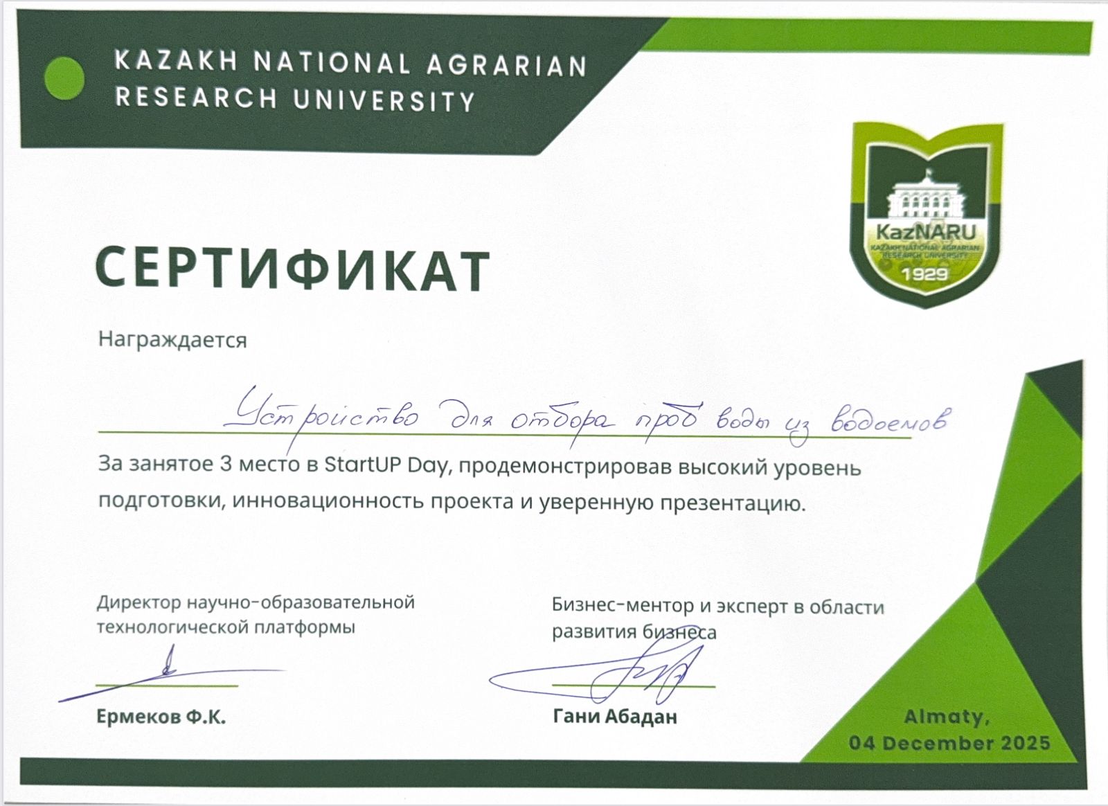 “ТИАШМИИ” ҰЗУ Алматы қаласындағы филиалының 2-курс студенттері — Нұрлан Темірлан Мақсатұлы, Кенже Айнұр Асылбекқызы, Ақбай Мерей Берікқызы, Асанхан Рахымжан Шерханұлы, Байғазы Диас Бақытжанұлы «Су қоймаларынан су сынамаларын алуға арналған құрылғы» жобасымен 3-орынға ие болып, сертификат пен ақшалай сыйлыққа ие болды. Қазылар алқасы жобаның экологиялық мониторингтегі маңызын ерекше атап өтті.