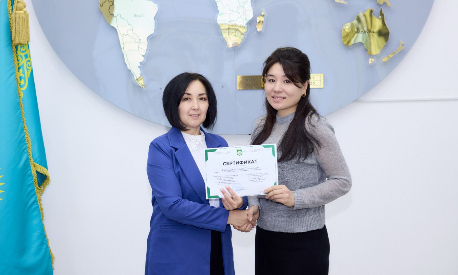Курс қорытындысы бойынша Біліктілікті арттыру бөлімі ұйымдастыруымен ҚазҰАЗУ-дың жас мамандарына ресми сертификаттар табысталды.
