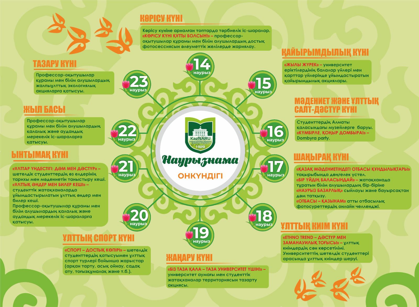 Алдағы күндерде де мерекелік шаралар өз жалғасын табады. 18 наурыз – Ұлттық киім күні, 19 наурыз – Жаңару күні, 20 наурыз – Ұлттық спорт күні, 21 наурыз – Ынтымақ күні, 22 наурыз – Жыл басы, 23 наурыз – Тазару күні аясында өтетін барлық шараларға барлығыңызды шақырамыз – бірге тойлап, Наурыздың шуағын бөлісейік!KazNARU Баспасөз қызметі