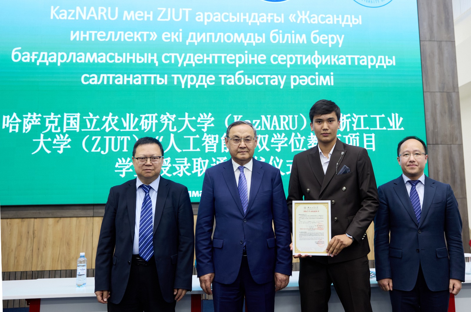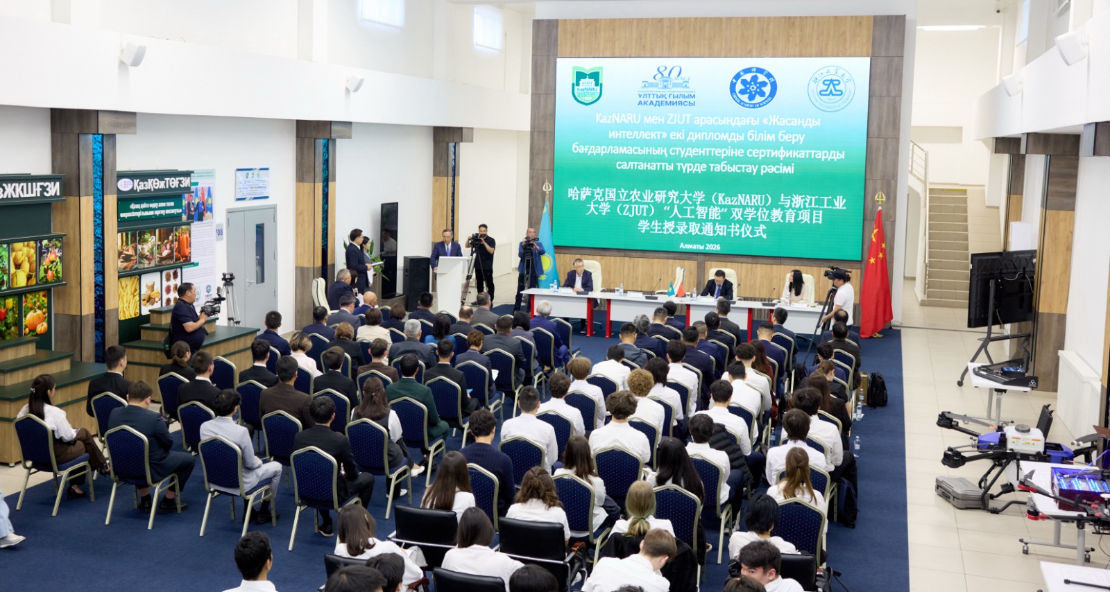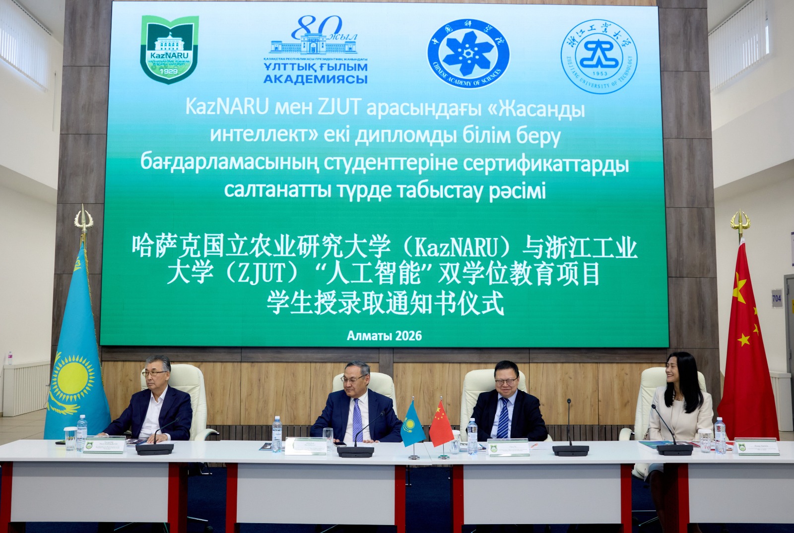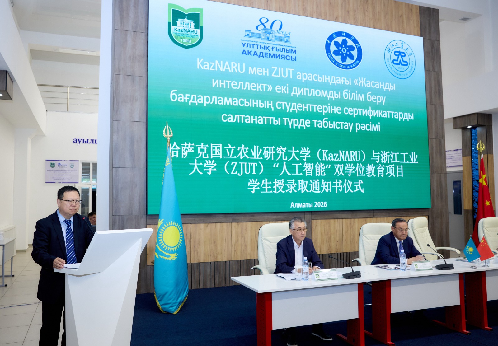 2026 жылдың 8 сәуірінде Қазақ ұлттық аграрлық зерттеу университетінде (KazNARU) Қытай Халық Республикасының Чжэцзян технологиялық университетімен (ZJTU) бірлесіп жүзеге асырылып жатқан «Жасанды интеллект» қосдипломды білім беру бағдарламасының студенттеріне сертификаттар табыстау рәсімі өтті. Іс-шара Алматы қаласындағы KazNARU-дың Су хабы залында «Болашаққа жол: AI дәуірі» атауымен ұйымдастырылды.