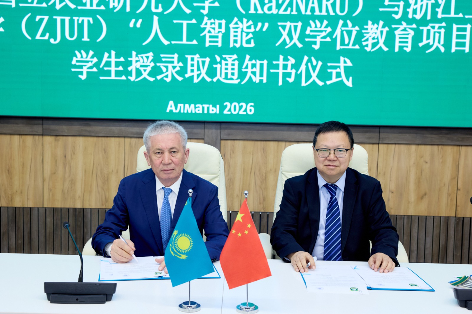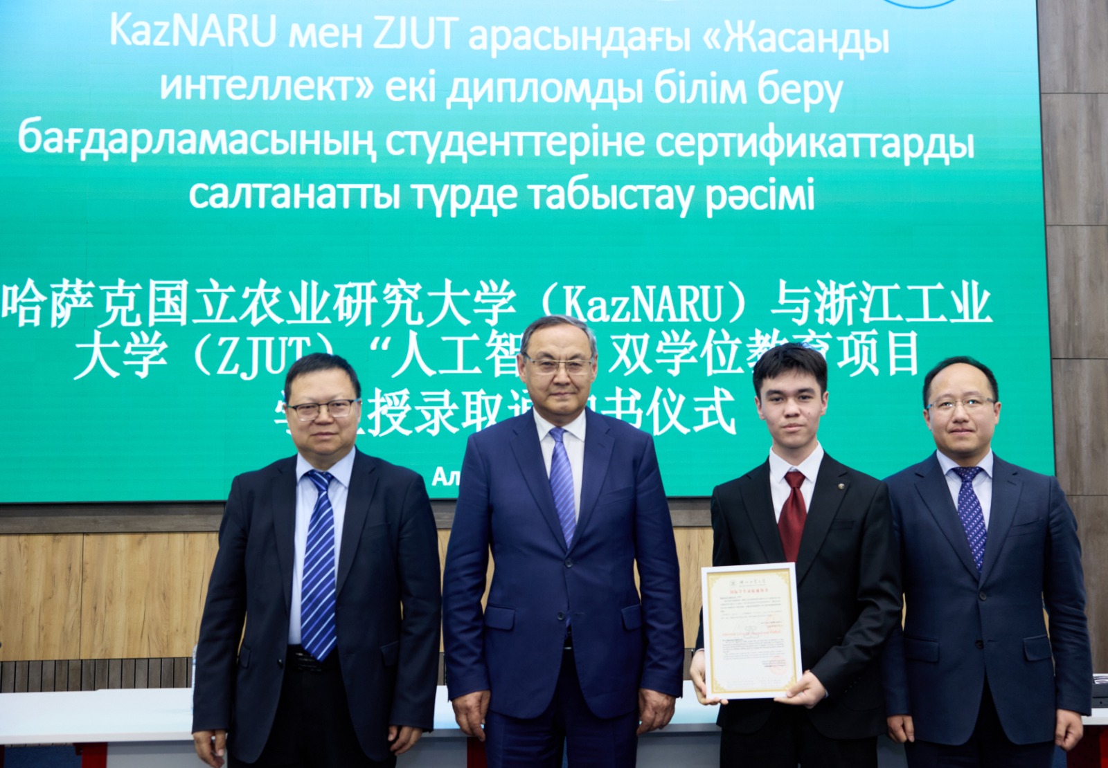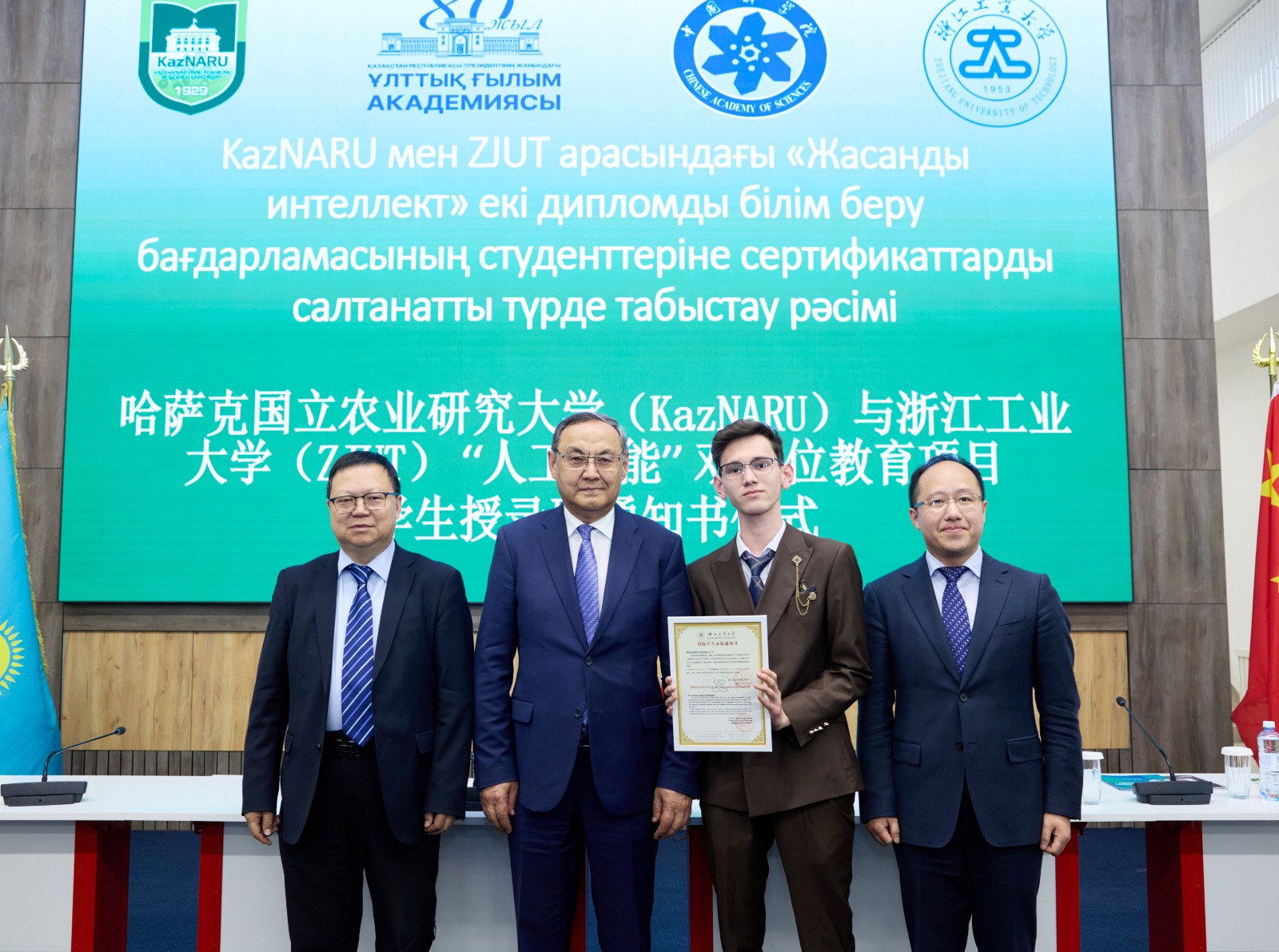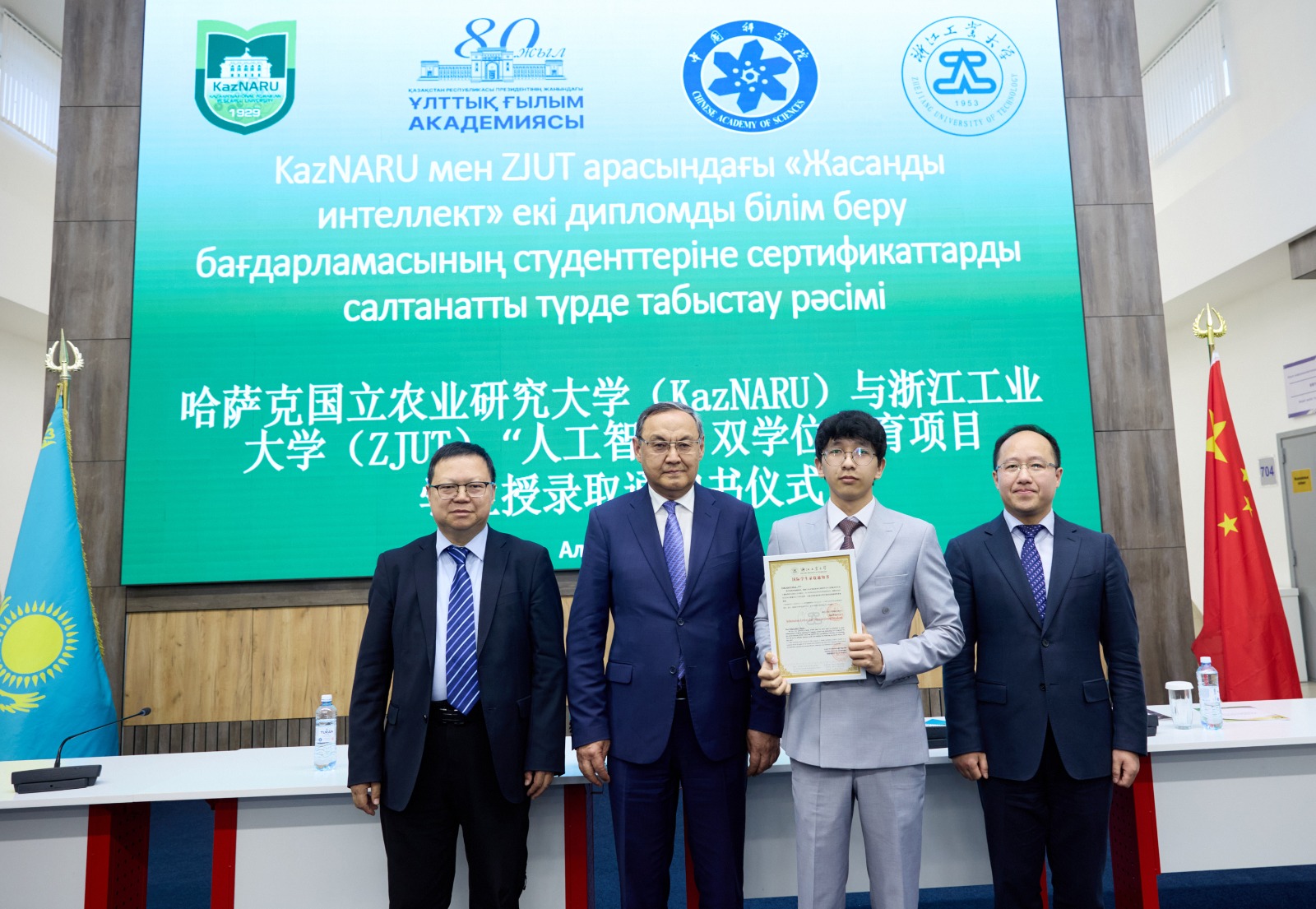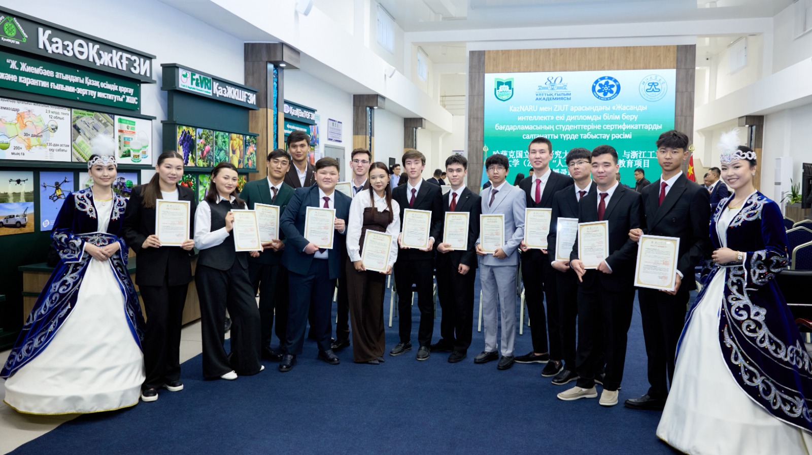 2026 жылдың 8 сәуірінде Қазақ ұлттық аграрлық зерттеу университетінде (KazNARU) Қытай Халық Республикасының Чжэцзян технологиялық университетімен (ZJTU) бірлесіп жүзеге асырылып жатқан «Жасанды интеллект» қосдипломды білім беру бағдарламасының студенттеріне сертификаттар табыстау рәсімі өтті. Іс-шара Алматы қаласындағы KazNARU-дың Су хабы залында «Болашаққа жол: AI дәуірі» атауымен ұйымдастырылды.