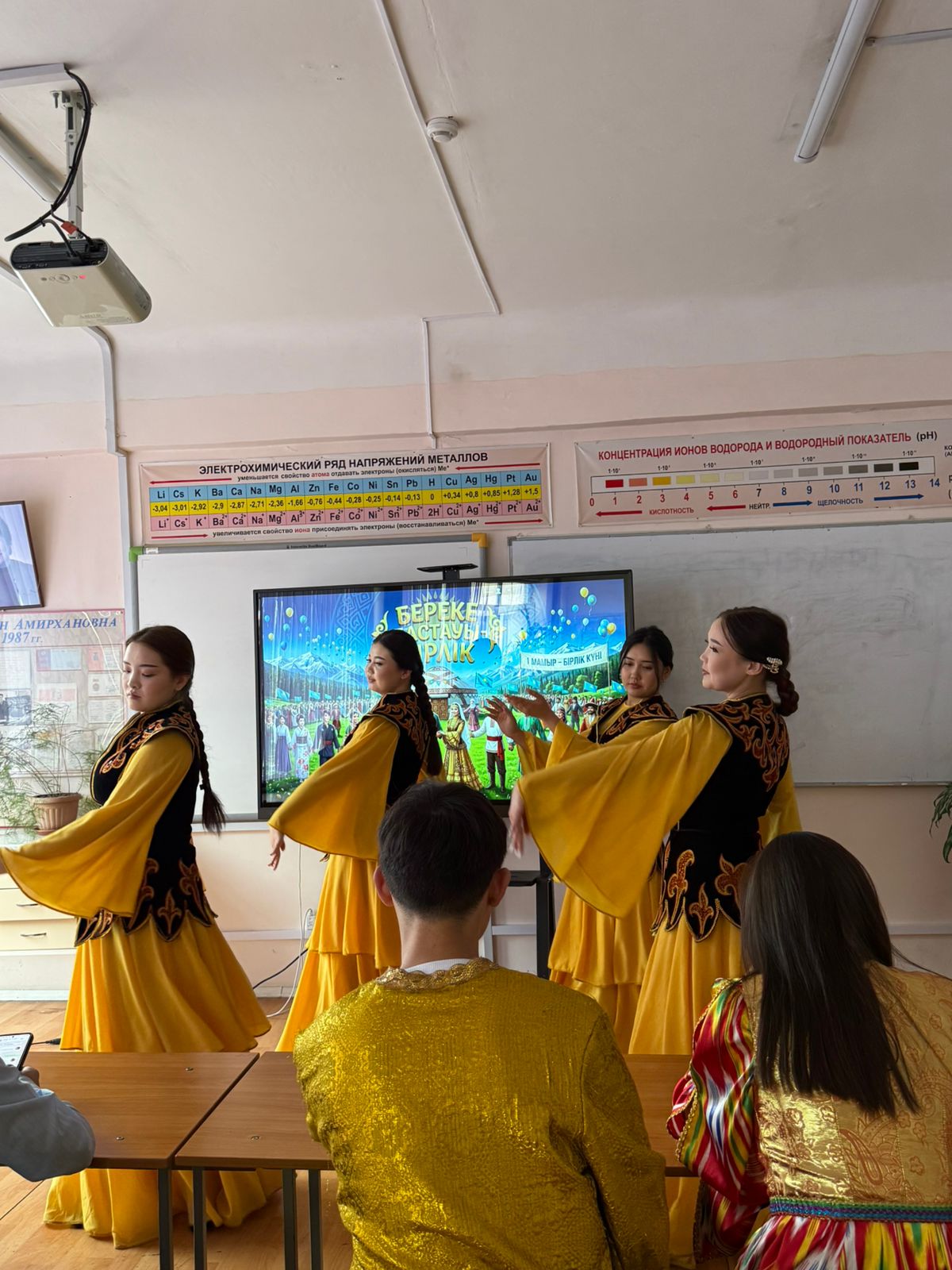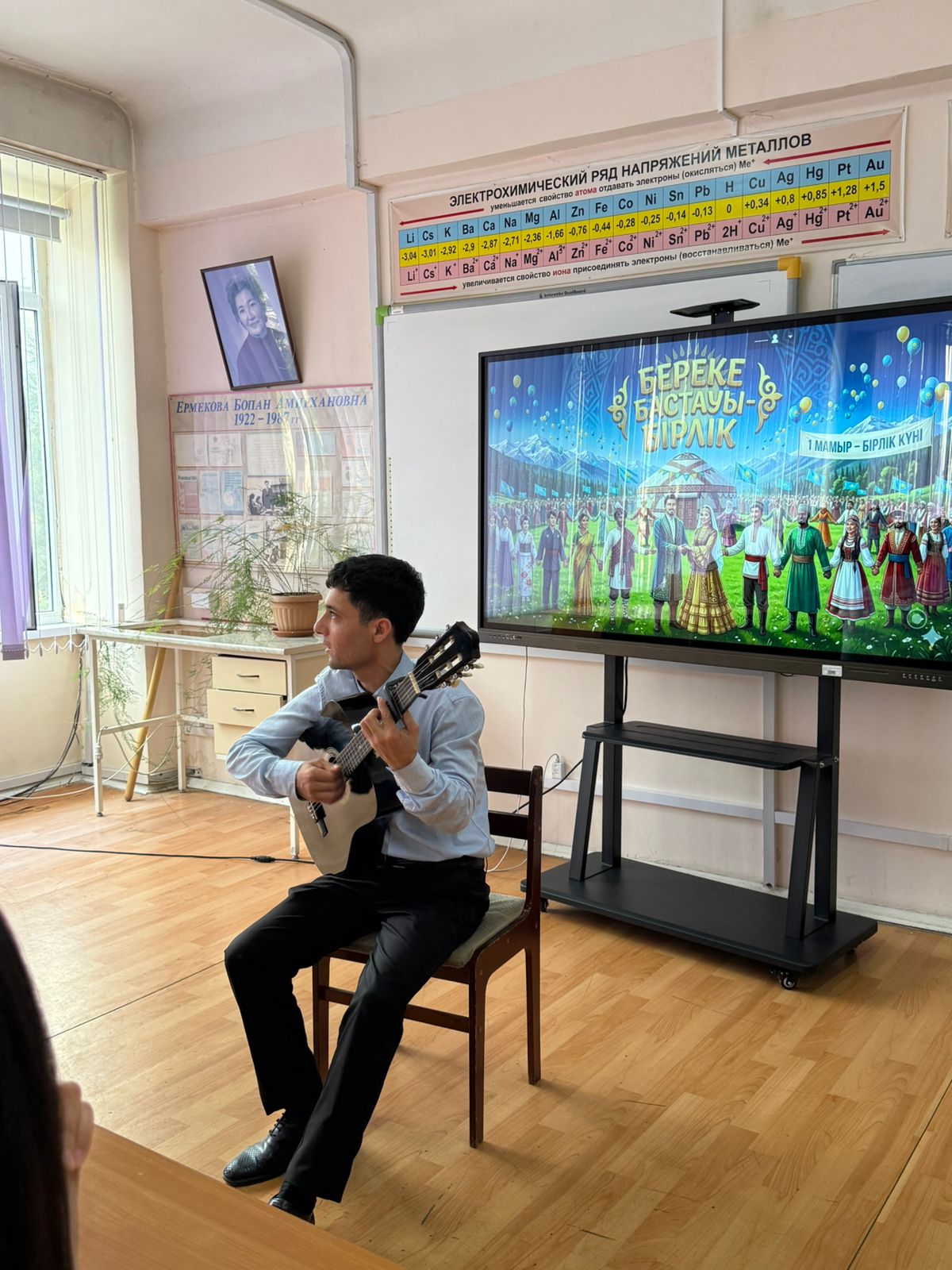 Жүргізуші ұлттардың татулығын, ұлыстардың бірлігін жырға қоса отырып, сахна төріне өзбек әні «Болайық бірге!» әнін тыңдауға шақырды. Ойнақы жеңіл әрі көңілді әуенді нақышына келтіре орындаған Экология-25-05 тобының студенттері Болатов Елдос пен Даулет Айжанның өнеріне білім алушылар дән риза болып, қошаметпен қол соқты.