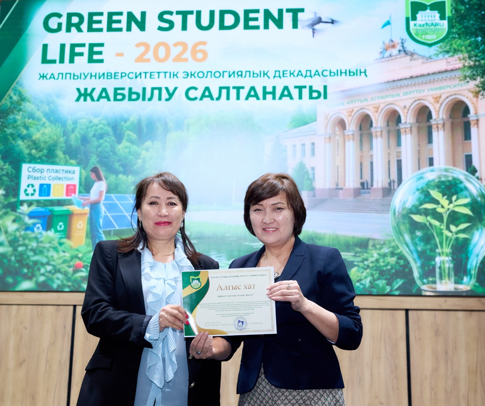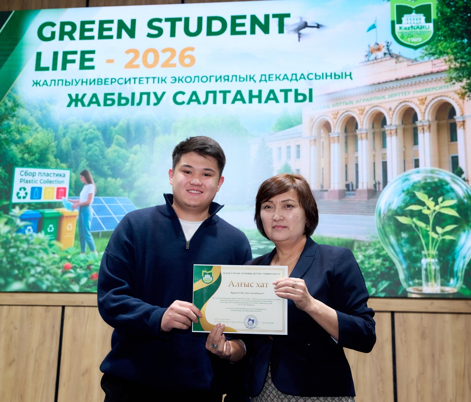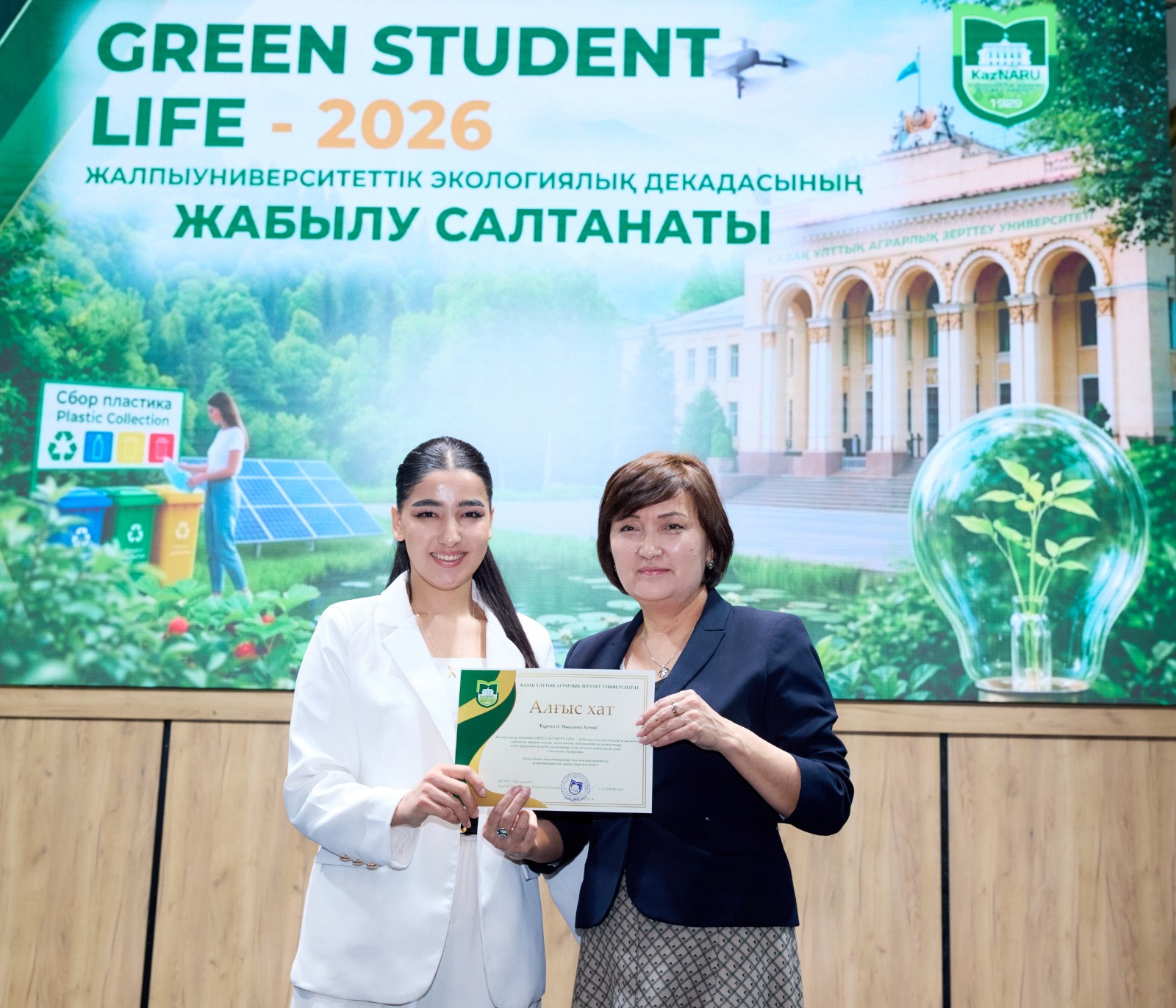 Жалпыуниверситеттік GREEN STUDENT LIFE – 2026 экологиялық декадасы аясында қоршаған ортаны қорғау, экологиялық мәдениетті қалыптастыру және тұрақты дамуды насихаттау ісіне белсене қатысқан бірқатар оқытушылар мен білім алушыларға ҚазҰАЗУ Басқарма Төрағасы – Ректоры Күрішбаев Ақылбек Қажығұлұлы атынан Алғыс хаттарды тәрбие жұмысы жөніндегі проректор Ералиева Асима Шанбаевна табыс етті.