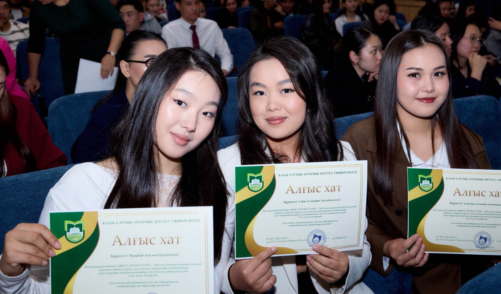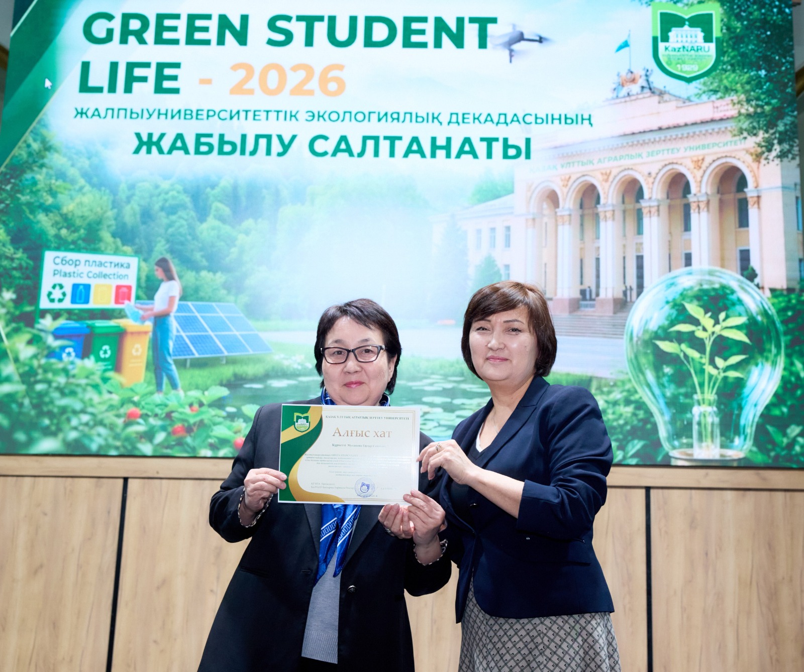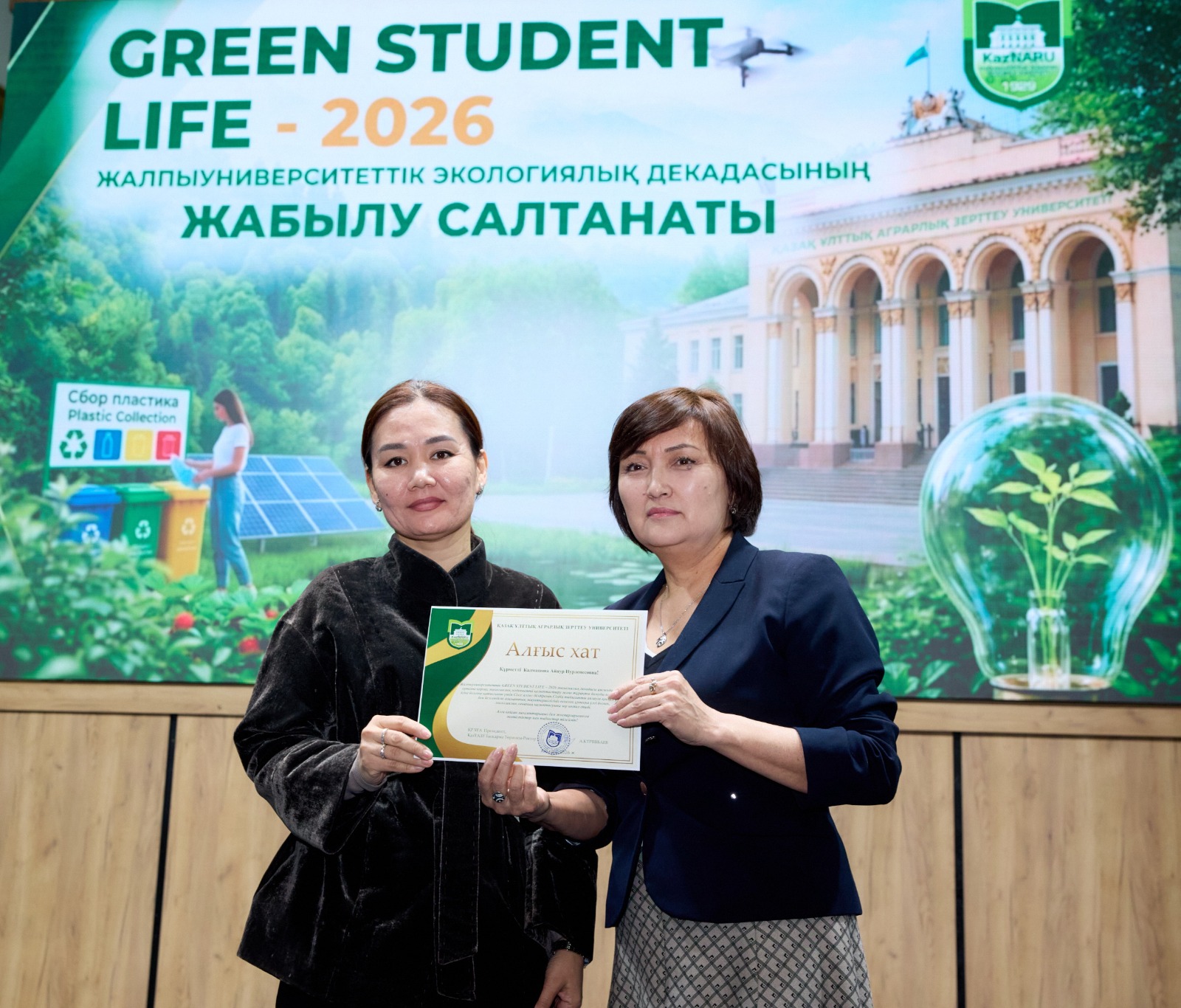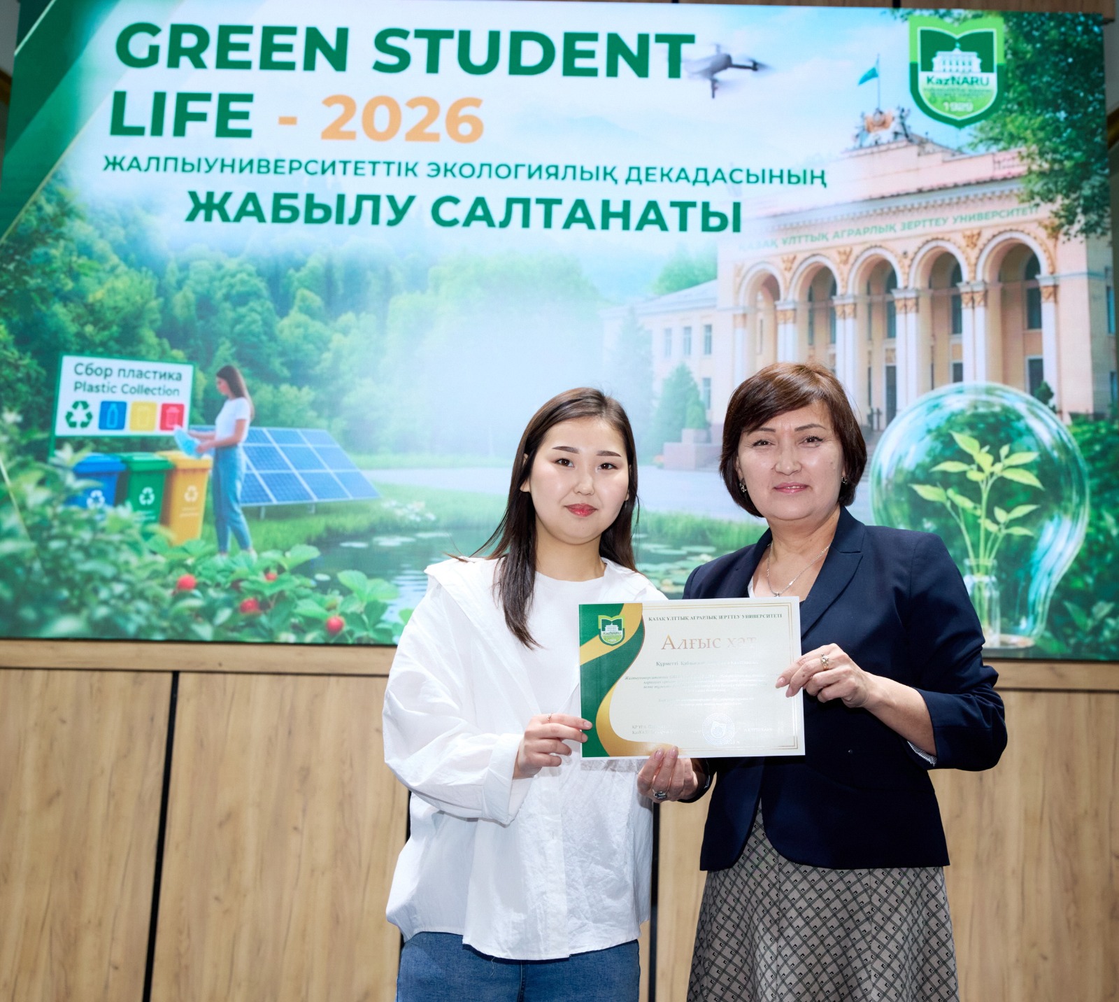 Жалпыуниверситеттік GREEN STUDENT LIFE – 2026 экологиялық декадасы аясында қоршаған ортаны қорғау, экологиялық мәдениетті қалыптастыру және тұрақты дамуды насихаттау ісіне белсене қатысқан бірқатар оқытушылар мен білім алушыларға ҚазҰАЗУ Басқарма Төрағасы – Ректоры Күрішбаев Ақылбек Қажығұлұлы атынан Алғыс хаттарды тәрбие жұмысы жөніндегі проректор Ералиева Асима Шанбаевна табыс етті.