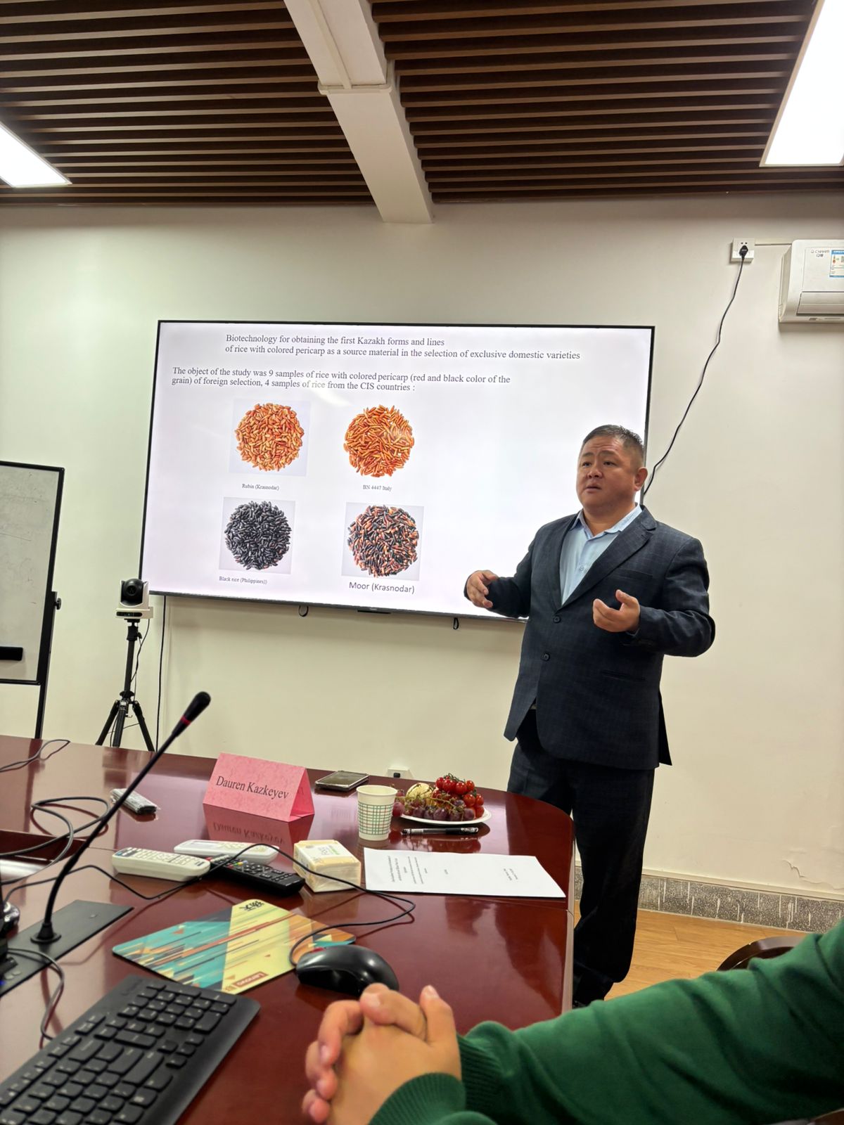 Казкеев Д.Т. выступил с докладом «Селекция пшеницы и риса на устойчивость к стрессам», где отметил необходимость внедрения жаро-, засухо- и солеустойчивых сортов культур, а также перспективы интродукции суходольного риса в Казахстане.