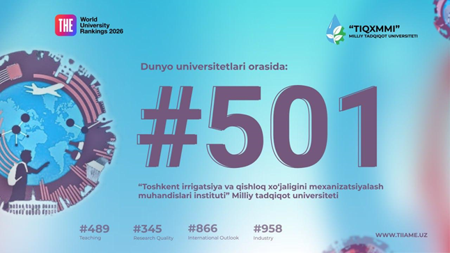 Согласно результатам рейтинга Times Higher Education (THE) World University Rankings 2026, Национальный исследовательский университет «Ташкентский институт инженеров ирригации и механизации сельского хозяйства» (ТИИИМСХ) продолжает укреплять свои позиции и занимать высокие места среди мировых университетов.