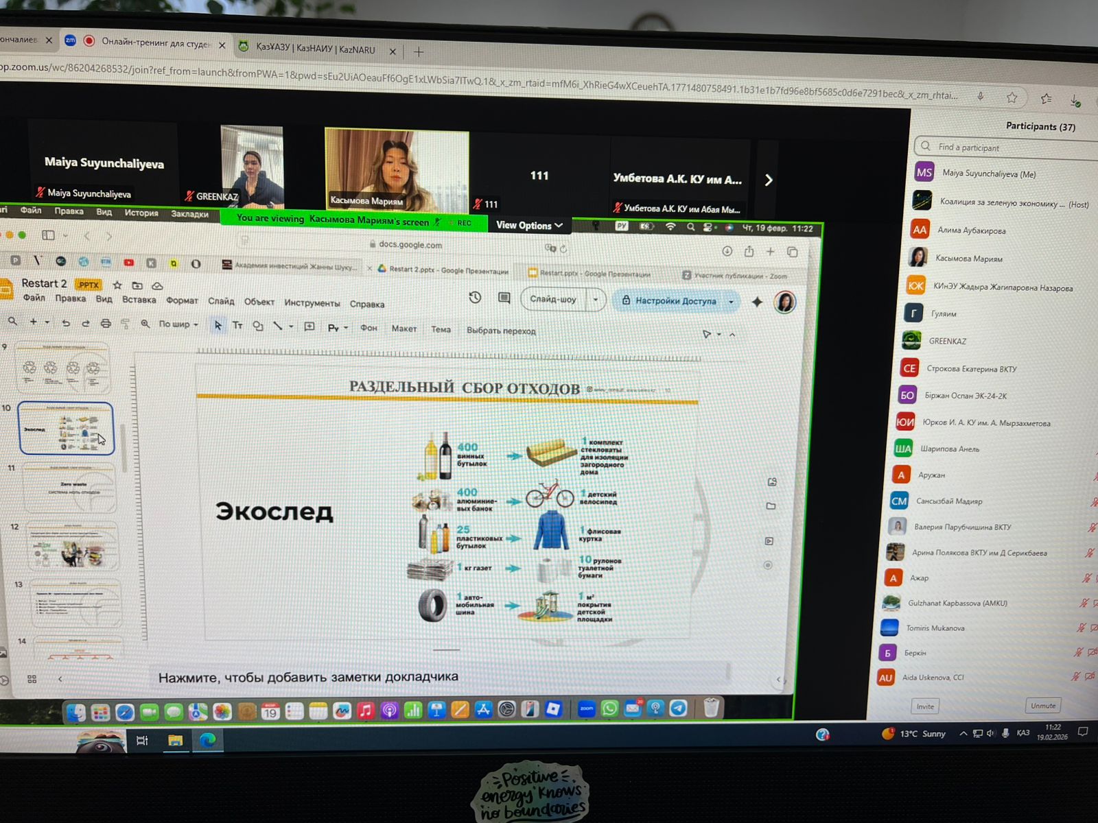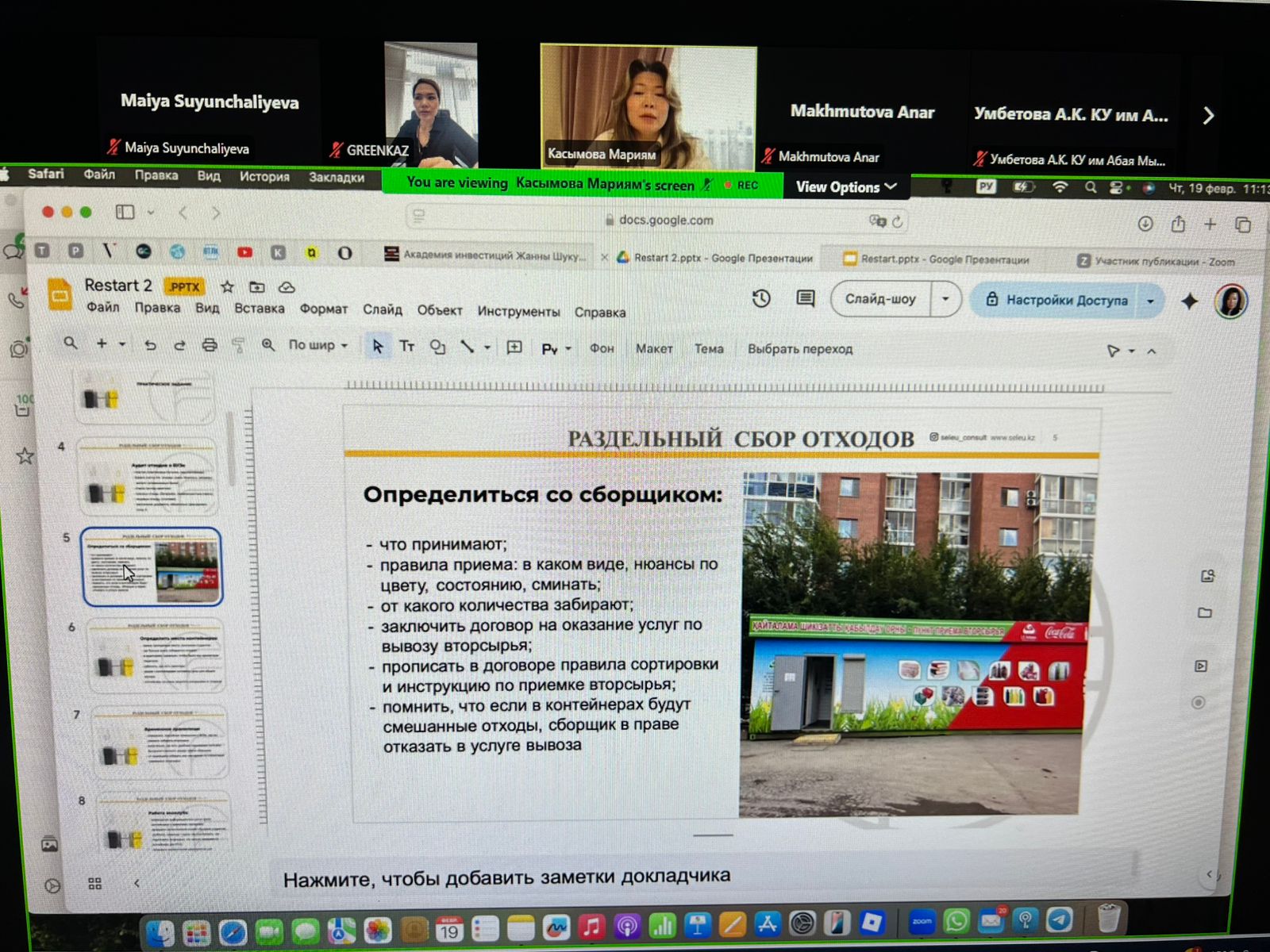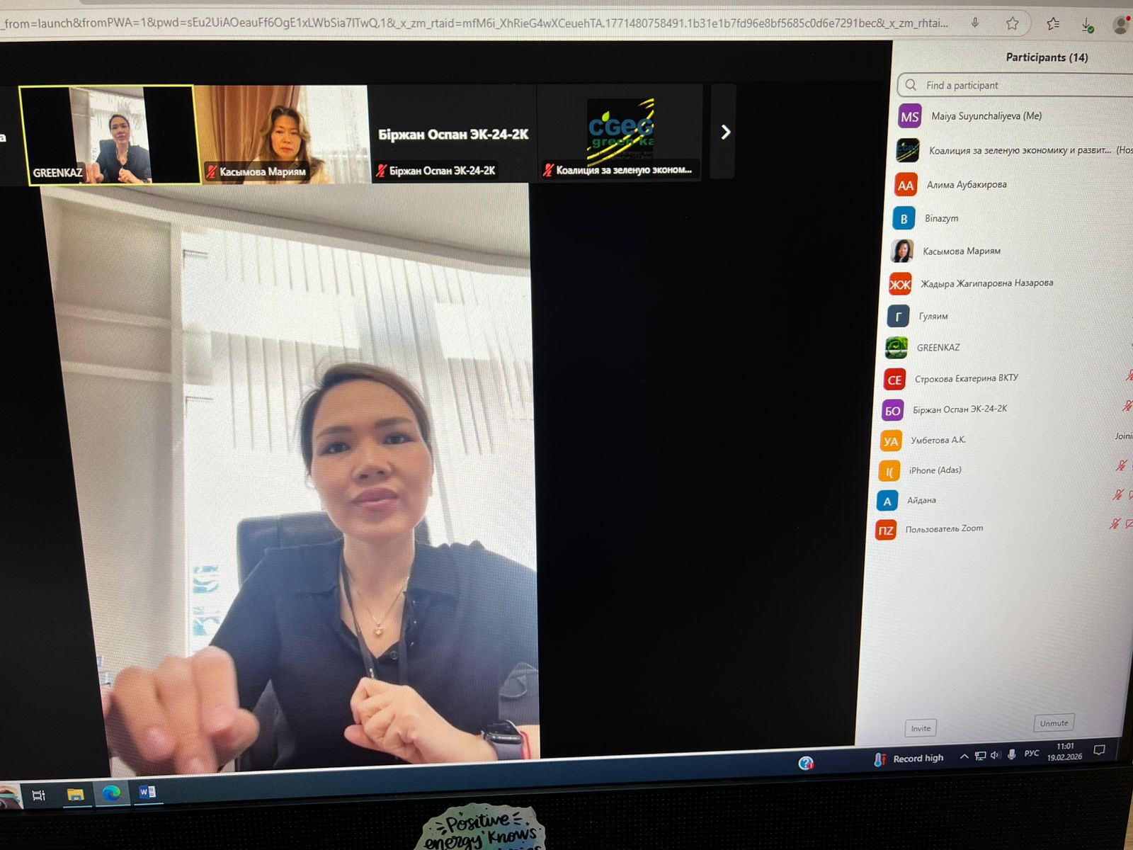 19 февраля 2026 года в 11:00-12:30 состоялся онлайн-тренинг «Zero Waste: как сократить отходы и выносить мусор реже», организованный в рамках экологического проекта «ReStart». Мероприятие направлено на повышение экологической осведомленности студентов и кураторов высших учебных заведений, а также на формирование практических навыков по сокращению отходов. На тренинге было 40 человек, среди участников были и представители КазНАИУ.