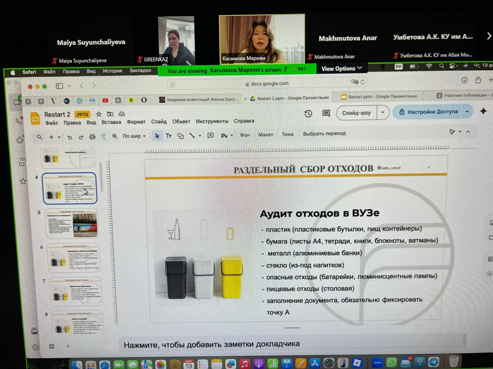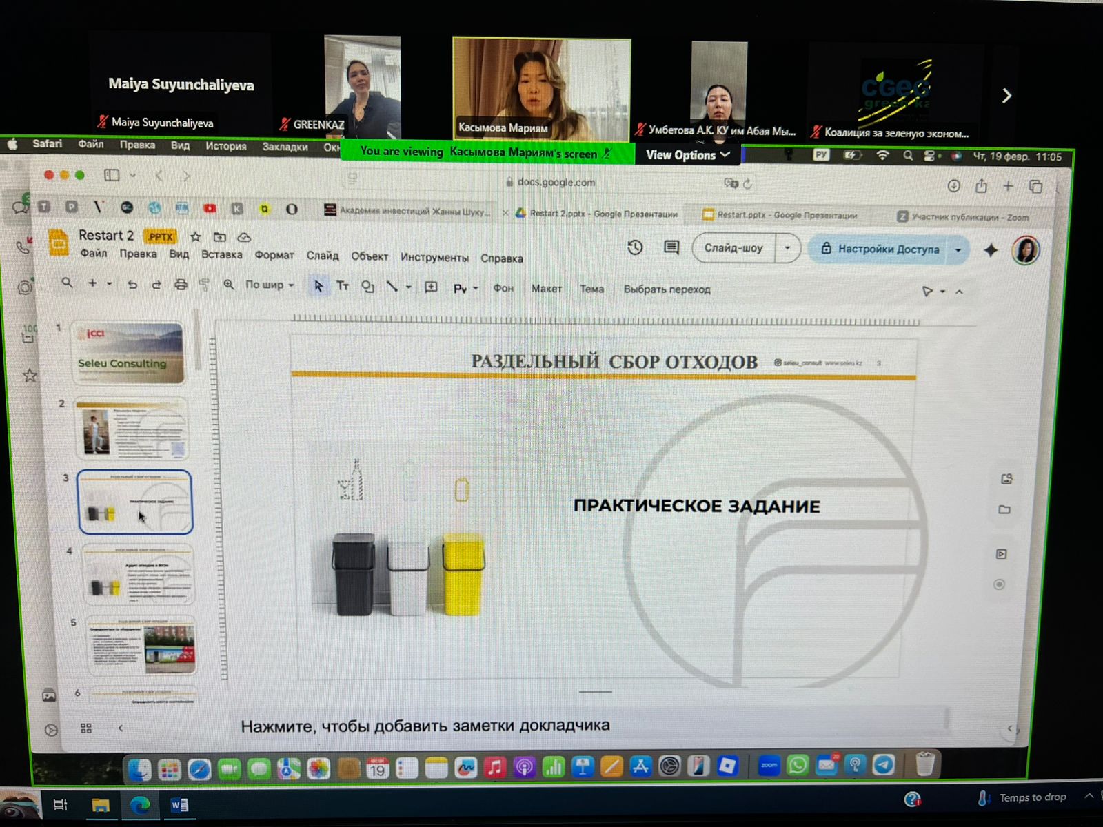 В ходе тренинга участники узнали об основных принципах концепции Zero Waste, эффективных способах сокращения количества бытовых отходов, а также о практических решениях, которые можно применять в повседневной жизни и университетской среде. Особое внимание было уделено раздельному сбору отходов, повторному использованию материалов и формированию экологически ответственного поведения.