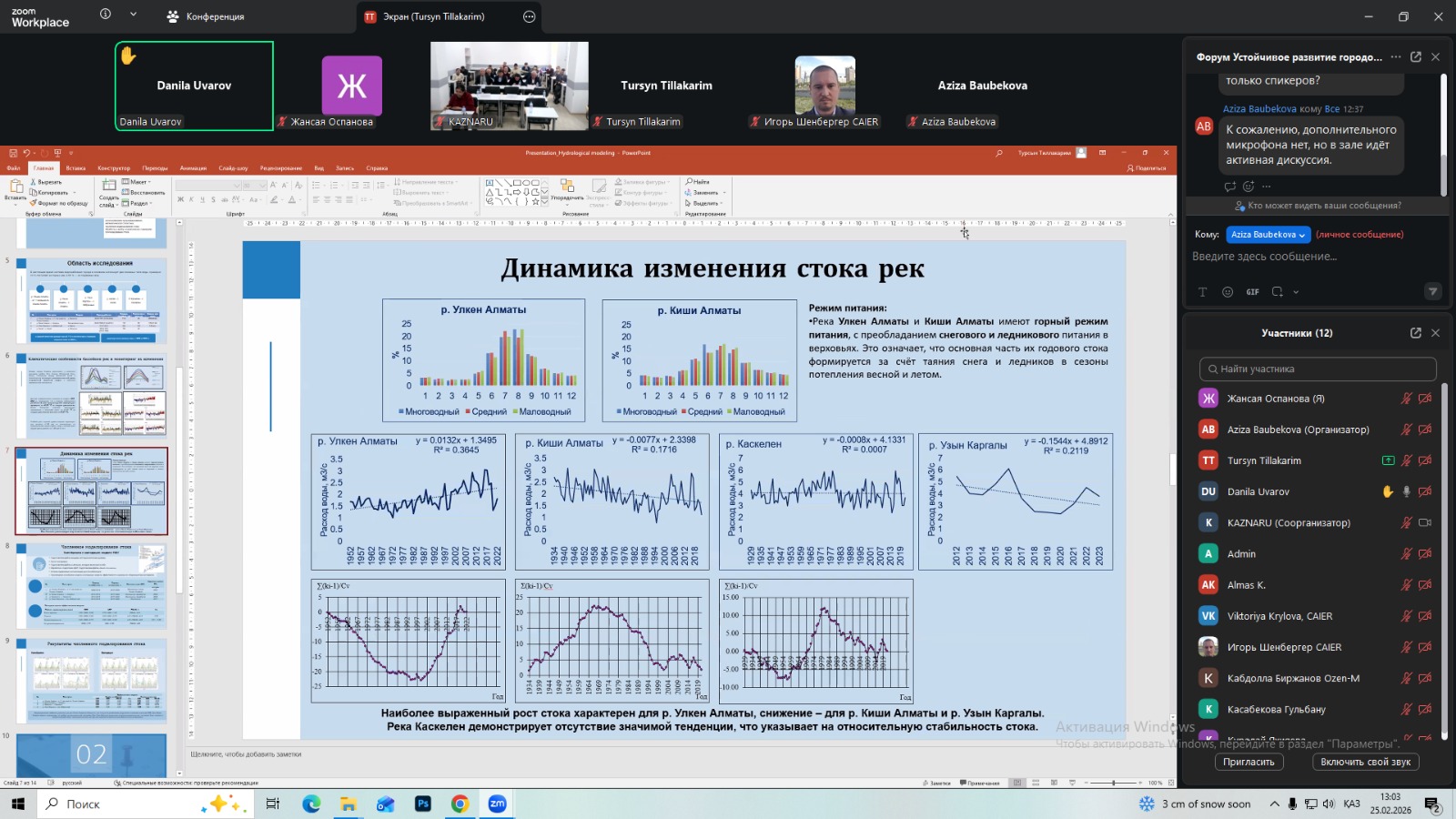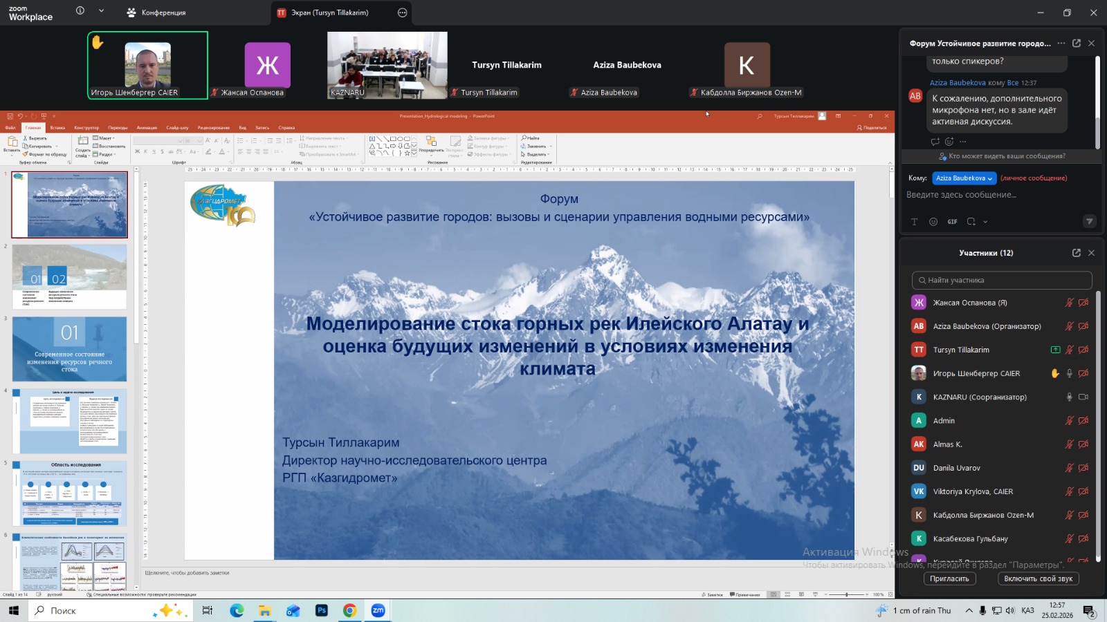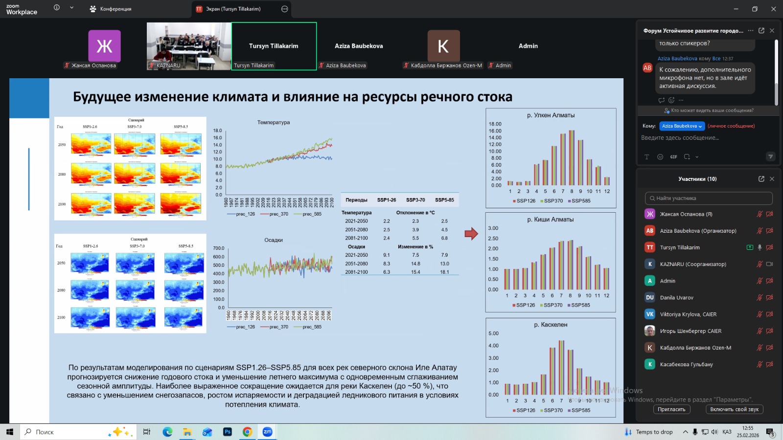 Ещё одним важным экспертным выступлением стала презентация Тілләкәрім Тұрсын Адамбекқызы — директора научно-исследовательского центра Казгидромет. В своём докладе она представила результаты моделирования стока горных рек Иле-Алатауского региона и оценки будущих изменений водности в условиях изменения климата, что вызвало активное обсуждение прогнозируемой ситуации по рекам Малая Алматинка, Большая Алматинка и Каскелен в контексте водоснабжения города Алматы и потенциальных рисков изменения гидрологического режима.