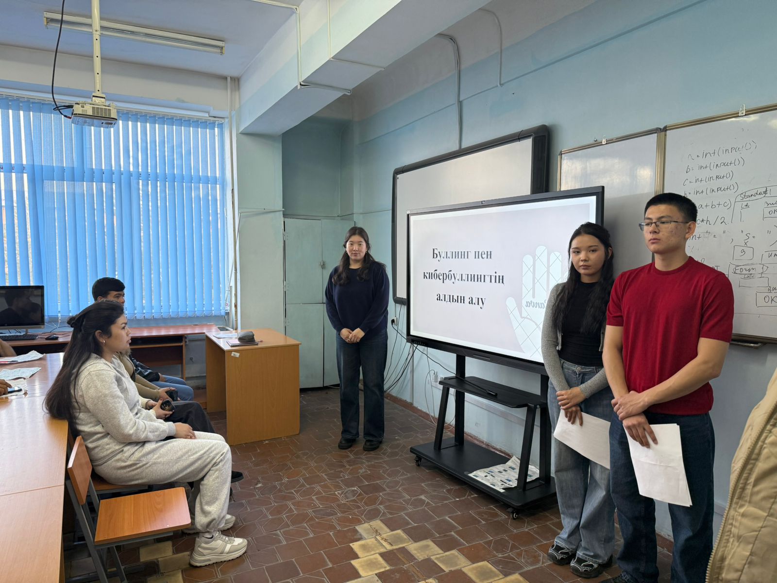 On November 17, 2025, the curators of groups II25-13k, IS25-02k(T), and IS25-03k(T), Shugyla Berdimurat and Akerke Abieva, organized an educational event titled “Prevention of Bullying and Cyberbullying.”