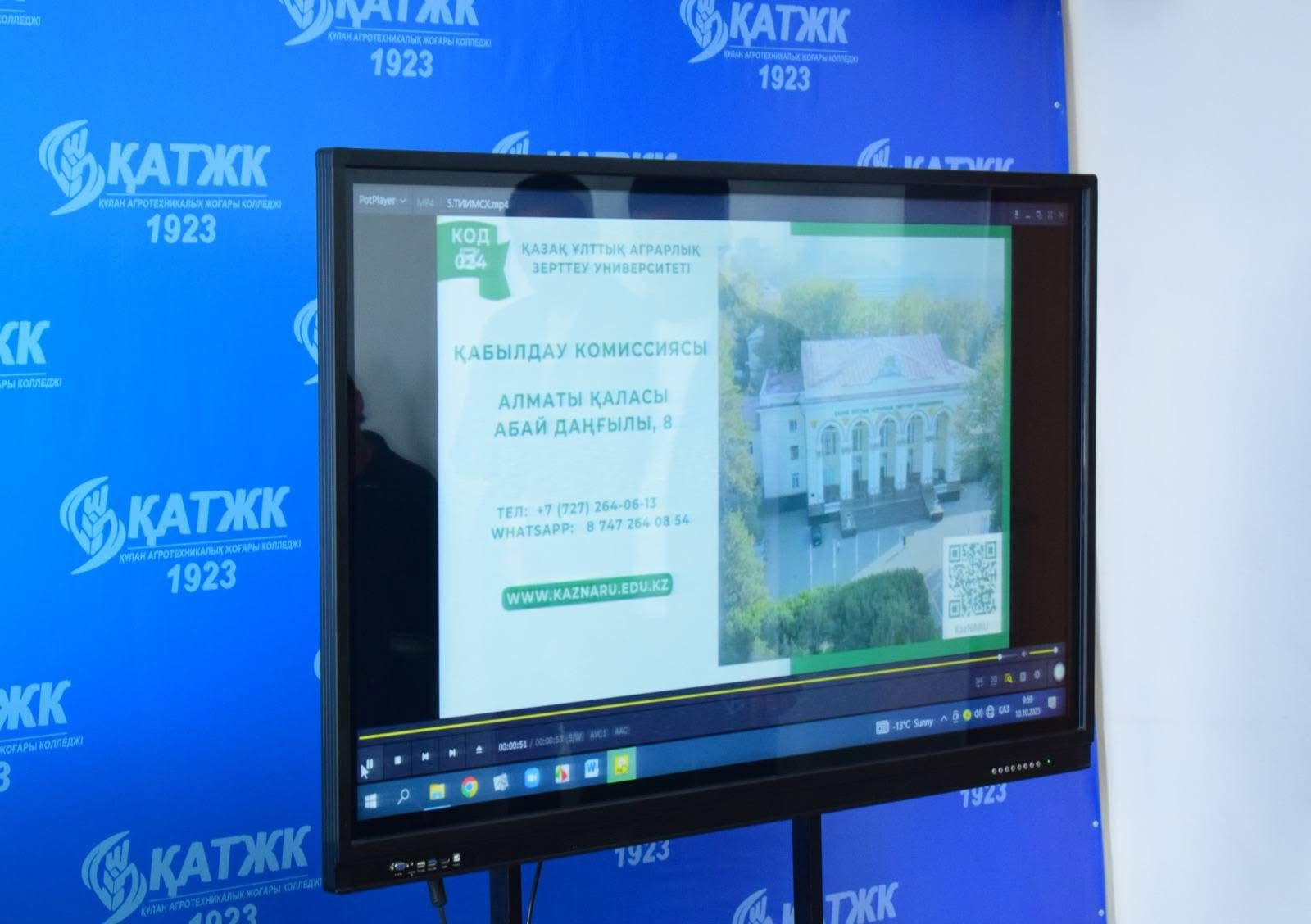 Қазақ ұлттық аграрлық зерттеу университеті “Агрономия, селекция және биотехнология” кафедрасының профессорлары — Жұматаев Марат Ермекбайұлы мен Құланбай Қаламқас Жаңабекқызы, сондай-ақ “Микробиология, вирусология және иммунология” кафедрасының меңгерушісі, PhD доктор Жылқайдар Арман Жетпісбайұлы Жамбыл облысы, Т. Рысқұлов ауданы, Құлан жоғары агро-техникалық колледжінде кәсіби бағдар беру кездесуін өткізді.