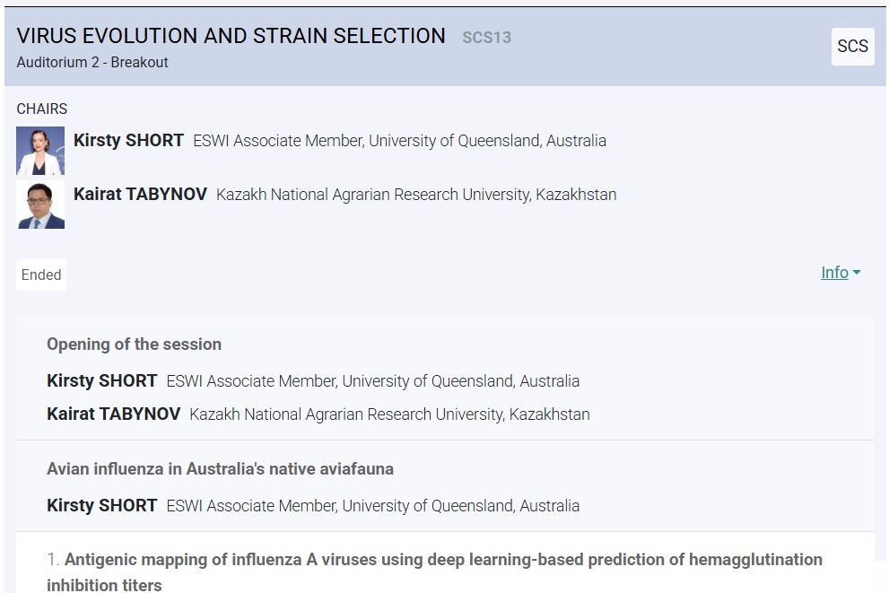 Сонымен қатар, профессор Қайсар Табынов конференция аясында “Virus Evolution and Strain Selection” атты секцияны әйгілі австралиялық ғалым доктор Кирсти Шортпен бірге жүргізді. Секция барысында вирустардың эволюциясы мен вакциналарға арналған штаммдарды іріктеу мәселелері талқыланды.
