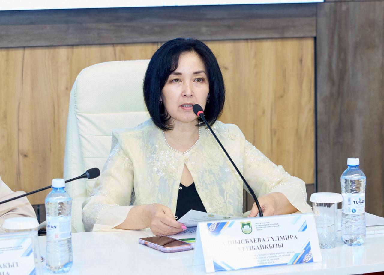«Қазақ ұлттық аграрлық зерттеу университеті» КеАҚ академиялық мәселелер жөніндегі проректоры, ветеринария ғылымдарының кандидаты Алпысбаева Гүлмира Егізбайқызы, Қазақстанның агроөнеркәсіп кешеніндегі кадрлық олқылық мәселесіне тоқталып, «Жаңа кәсіптер атласы» мен кадрлар қажеттілігінің өңірлік карталары негізінде білім беру бағдарламаларын жаңартудағы университет әдісімен таныстырды.
