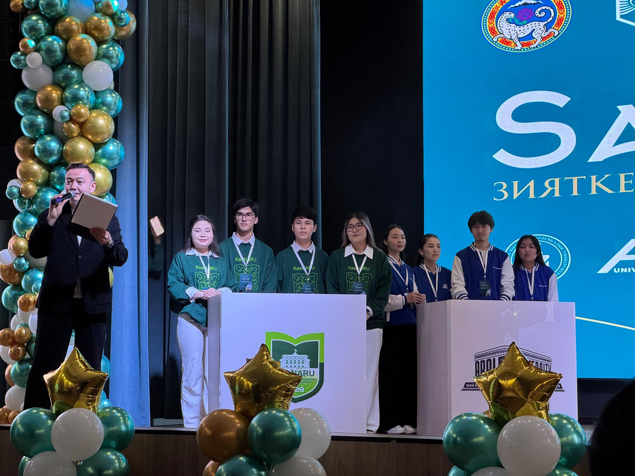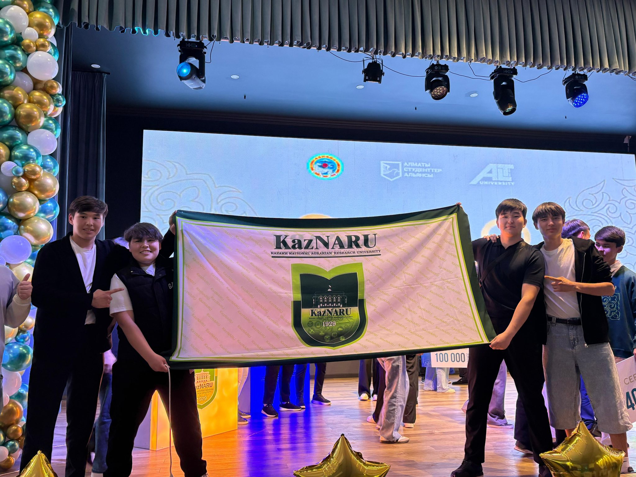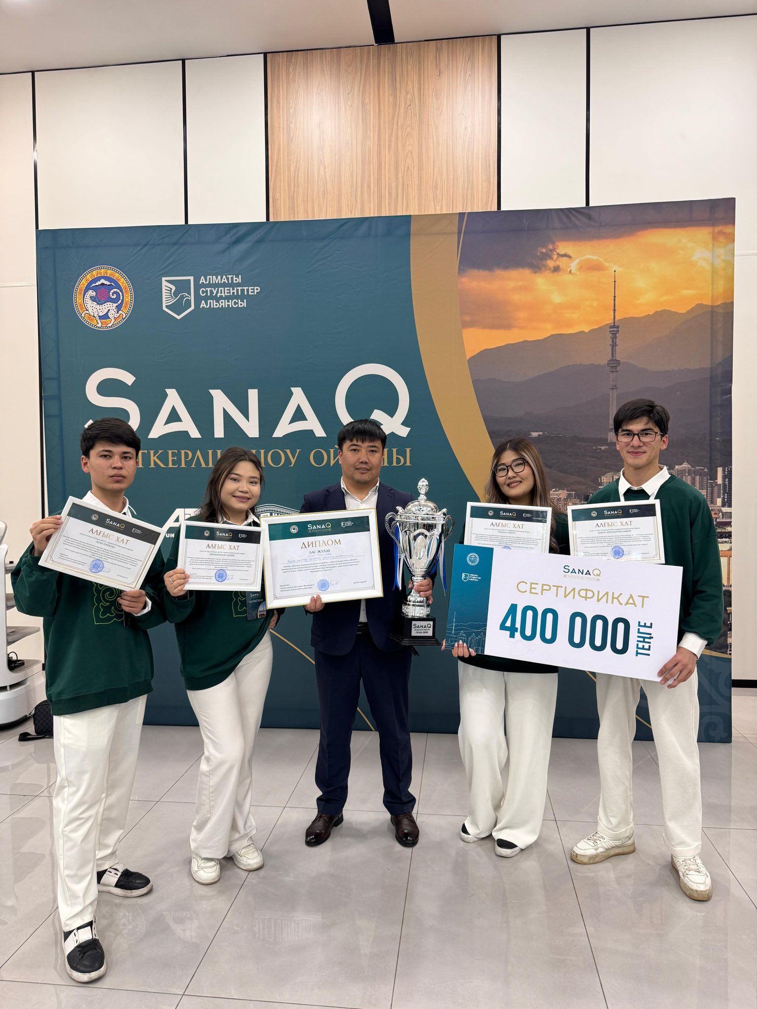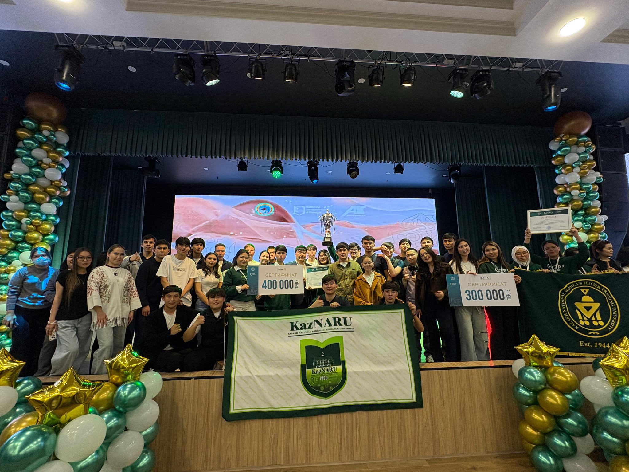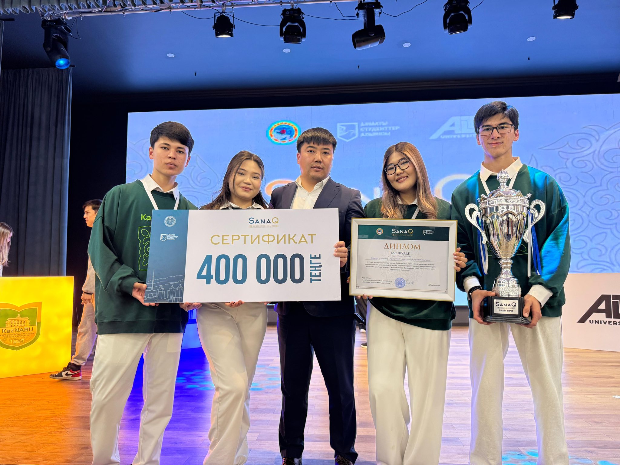 Алматы қаласы әкімі аппаратының «Қоғамдық келісім» мекемесінің қолдауымен және «Алматы студенттер Альянсы» корпоративтік қорының ұйымдастыруымен жоғары оқу орындары арасында өткен «SanaQ» зияткерлік ойынында KazNARU студенттері бас жүлдені жеңіп алды!