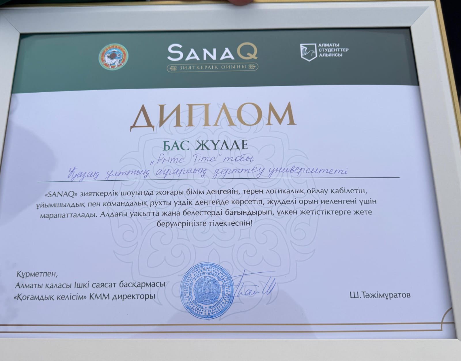 Бүгін, ALT университетінде өткен финалда университетіміздің намысын қорғаған «Prime time» командасы өздерінің білімділігі мен тапқырлығын дәлелдеп, І дәрежелі дипломмен және 400 000 теңге көлеміндегі қаржылай сертификатпен марапатталды.
