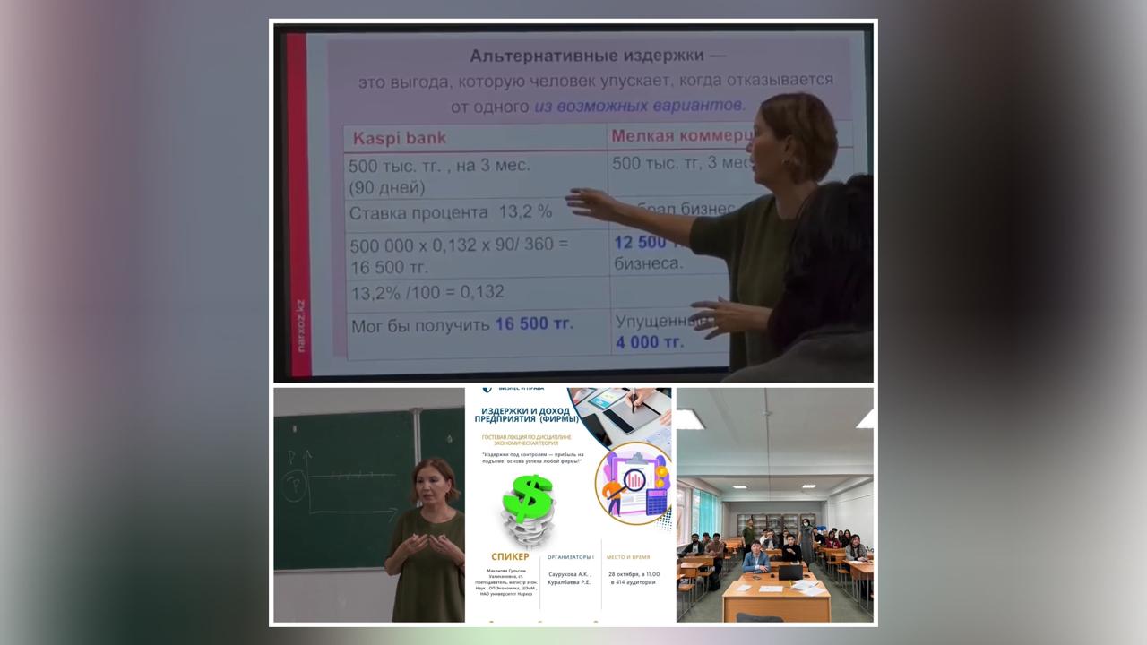 28.10.2024 ж. Кафедраның э.ғ.к., қауым.профессор Саурукова А.К., PhD аға оқытушы Құралбаева Р.Е. «Экономикалық теория» пәнінен «Шығындар бақылауда - пайда өсуде: кез келген фирманың табысының негізі!» тақырыбы бойынша Нархоз университетінің магистрі, аға оқытушы спикер Макенова Гульсим Уалихановнаның қатысуымен қонақ дәрісін өткізді.