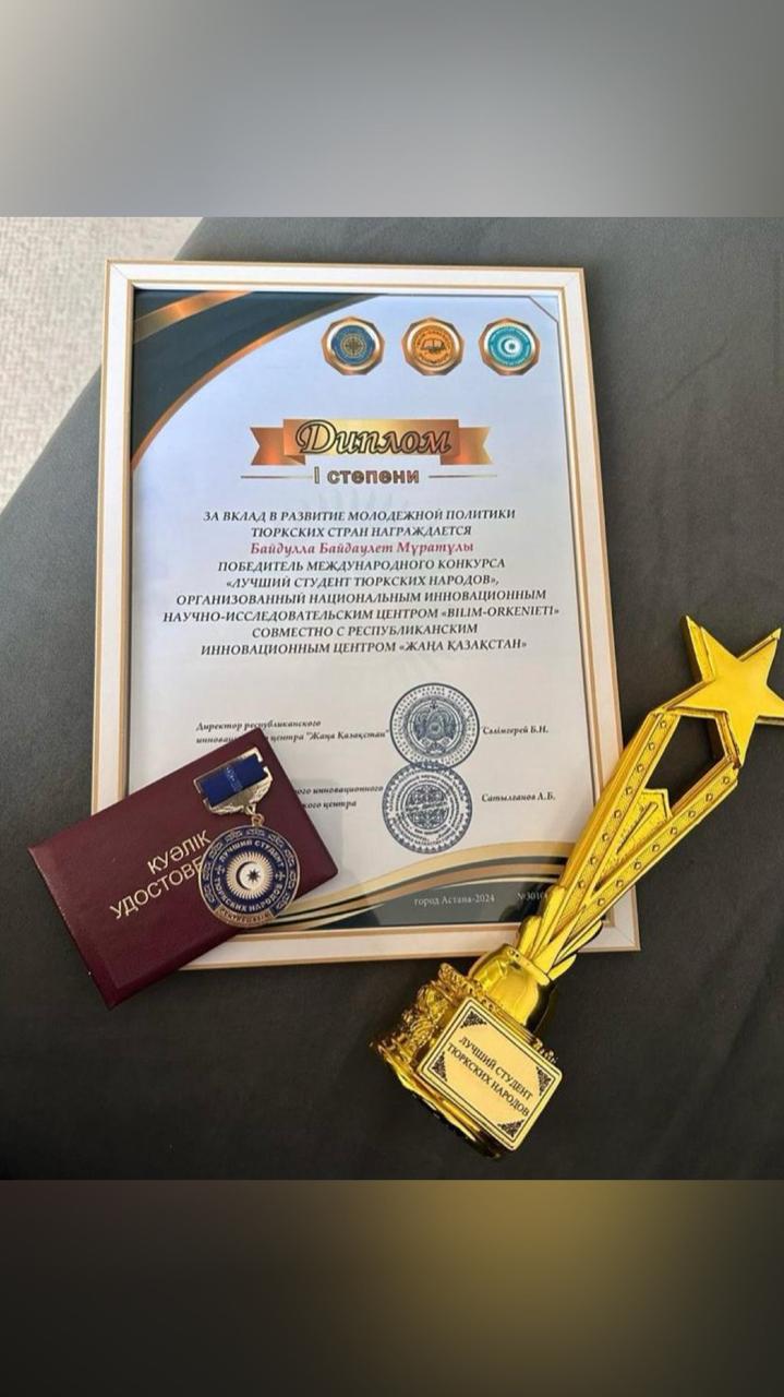 Түркі халықтарының “Үздік студенті” атты байқауда І-ші дәрежелі дипломмен 6В04105 - “Мемлекеттік және жергілікті басқару” БББ 4-курс студенті Байдулла Байдаулет марапатталды. Құттықтаймыз!!!