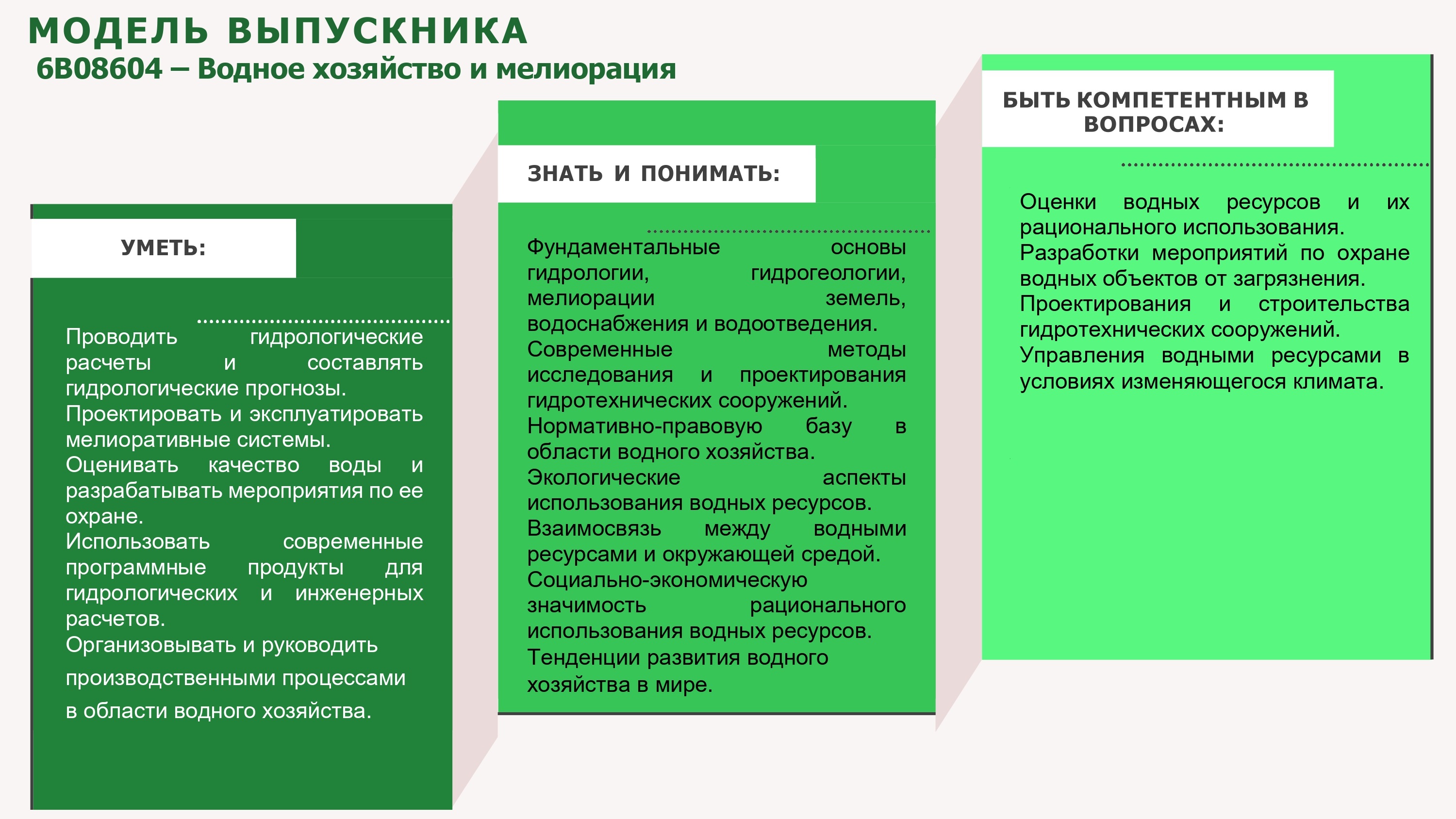 Рациональное использование водных ресурсов и их охрана от загрязнения, засорения, истощения; обслуживание и эксплуатация водохозяйственных систем и сооружений; контроль норм водопотребления и водоотведения, контроль гидрологического режима и их рациональное использование, ведение государственного мониторинга поверхностных водных объектов и управление водными ресурсами. Мелиоративные системы и сооружения, природно-техногенные комплексы.