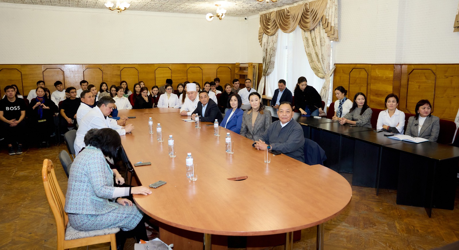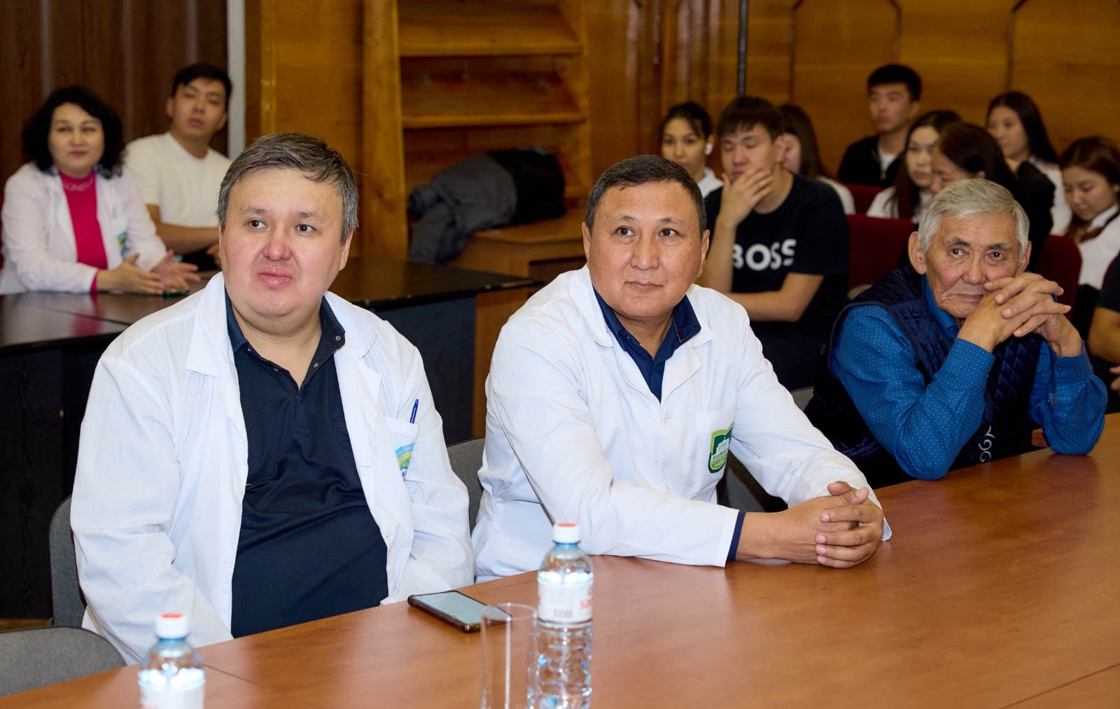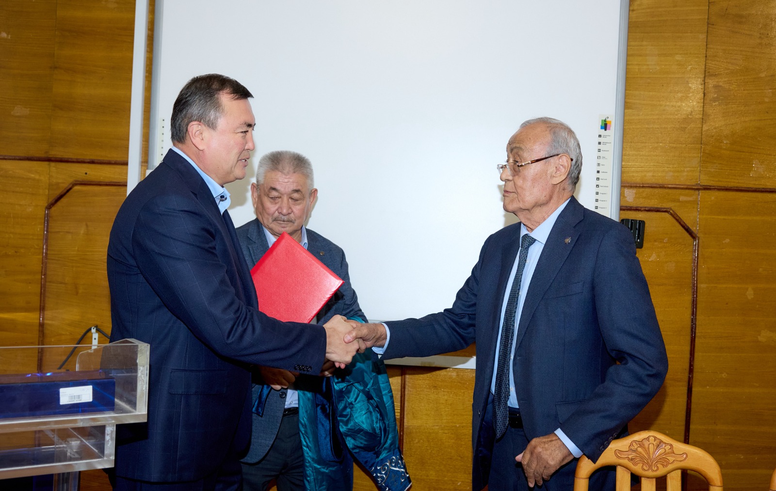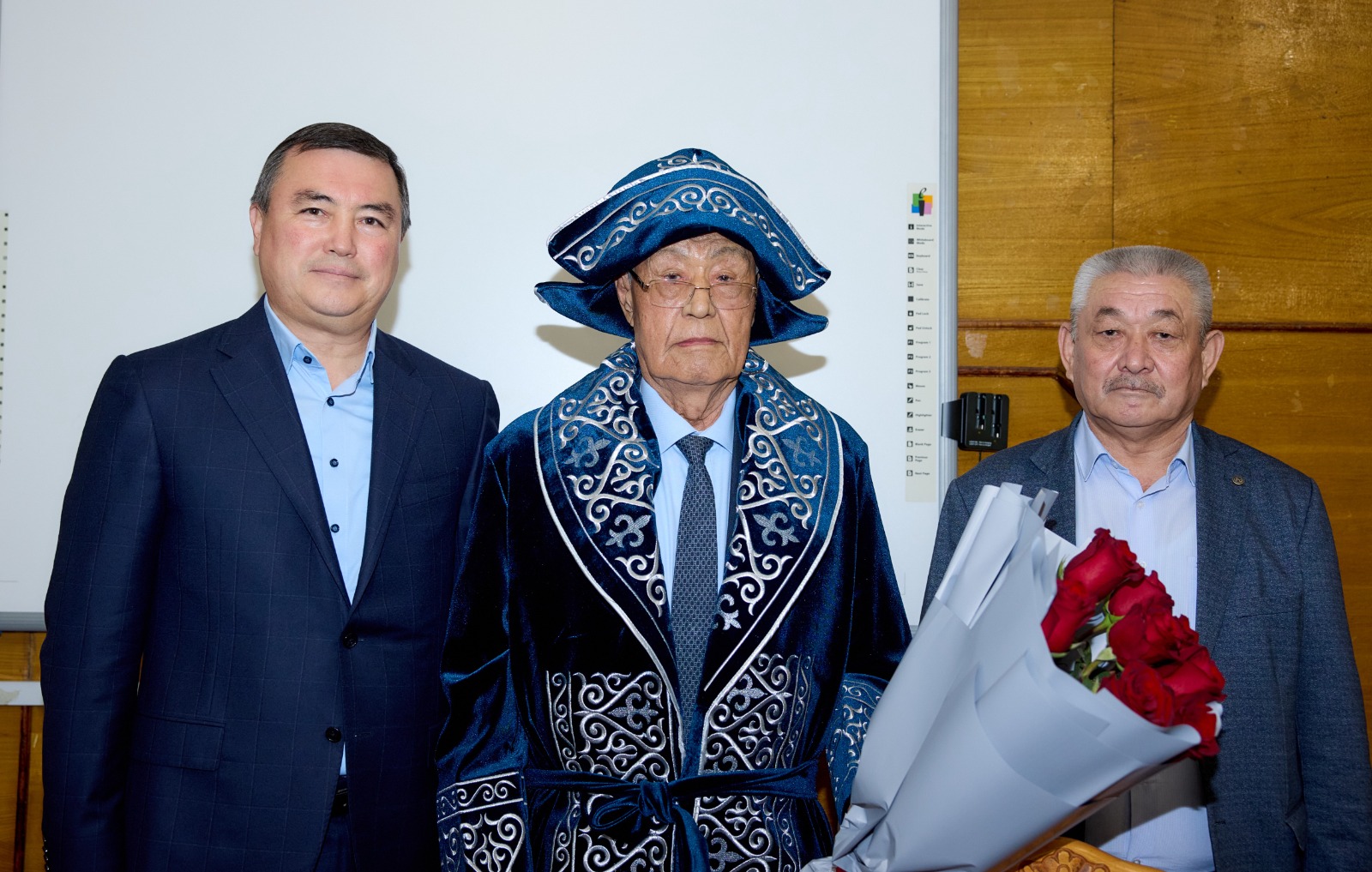 В праздничном собрании принял участие член Правления университета, заместитель Председателя Правления – Ректора Куат Елеусизович Султангазиев, который от имени Председателя Правления – Ректора, Президента НАН РК Акылбека Кажигулулы Курыжбаева вручил юбиляру поздравительное письмо и надел на него почётный шапан. Этот момент был встречен громкими аплодисментами студентов и коллег учёного.